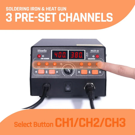 - Memória de temperatura de 3 canais tanto para o ar quente como para o ferro de soldar permite-lhe armazenar e alternar rapidamente entre múltiplos perfis de temperatura, simplificando tarefas de soldadura complexas.