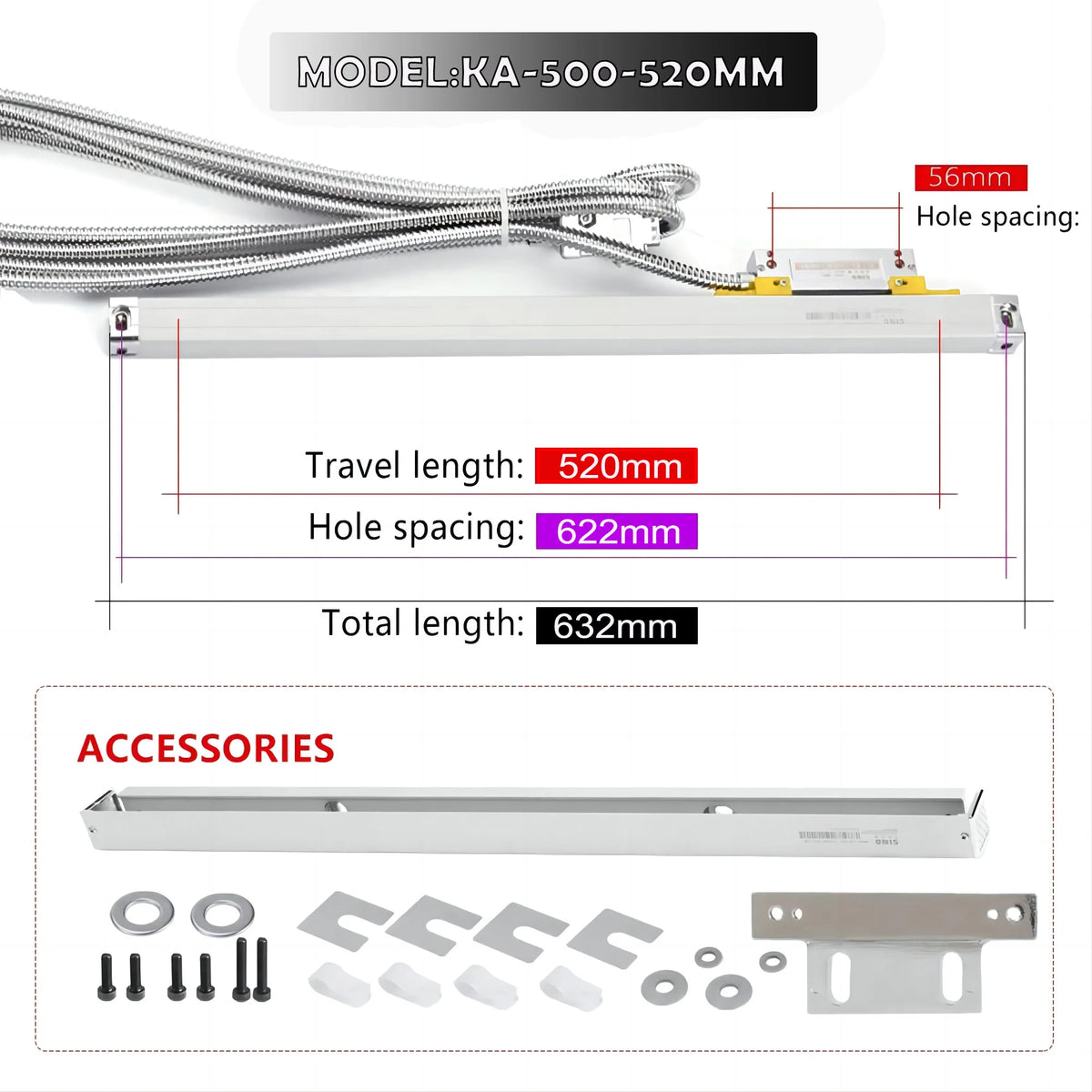 Compacto e versátil, o KA500 é construído para aplicações de Fresadora, Torno, Moedor e CNC. Possui uma interface DB9, saída TTL e um cabo de 3 metros, com um alcance de deslocamento de 70 mm a 520 mm e um comprimento total da escala de Deslocamento+112 mm. O sistema opera de 0 a 50°C e é protegido IP54, garantindo desempenho confiável em ambientes típicos de oficina. É fabricado na China Continental pela SINOC e projetado para ser compatível com a maioria dos DROs da China.
