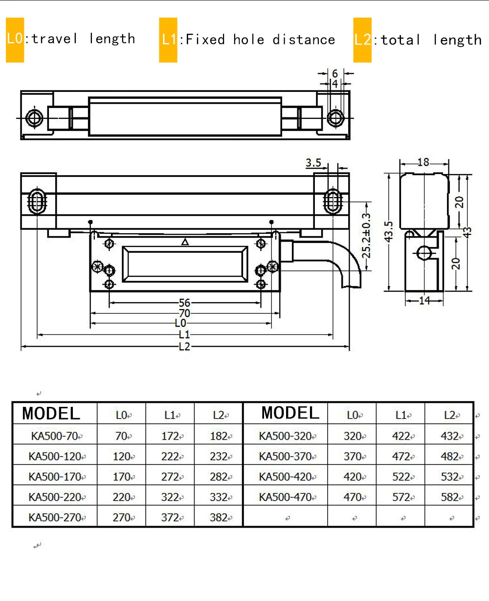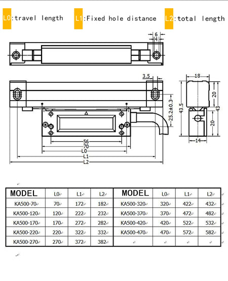 - Comprimento de deslocamento disponível do KA500: 70 mm–520 mm