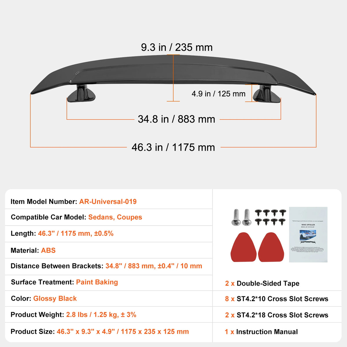 Spoiler de Carro Vevor GT Wing 46.3 Polegadas Universal Preto ABS