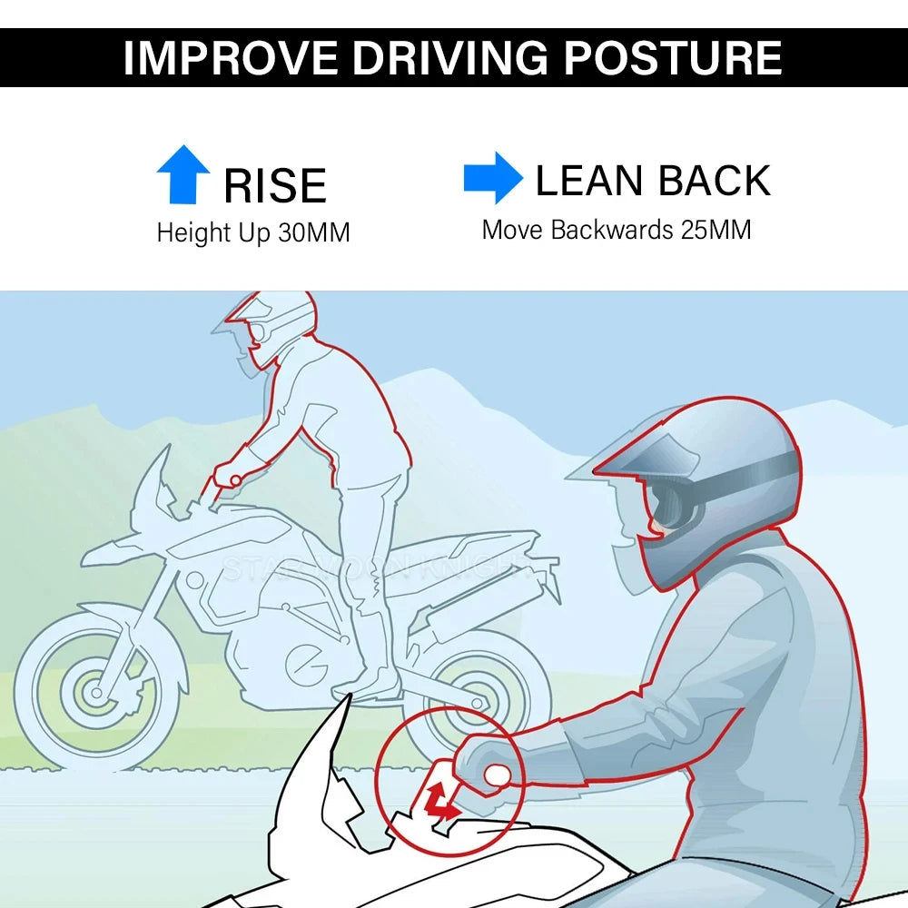 Apresentamos a Extensão Elevadora do Guiador Voge 900 DSX com Elevadores Deslocados da Star Moon Knight — uma atualização inteligente que combina elevação com uma posição de condução mais próxima e ergonómica. Ao aproximar o guiador e elevá-lo ligeiramente, este conjunto de elevadores ajuda a reduzir a tensão nas costas, pélvis, cóccix e braços, tornando as viagens longas e o turismo mais confortáveis e agradáveis.