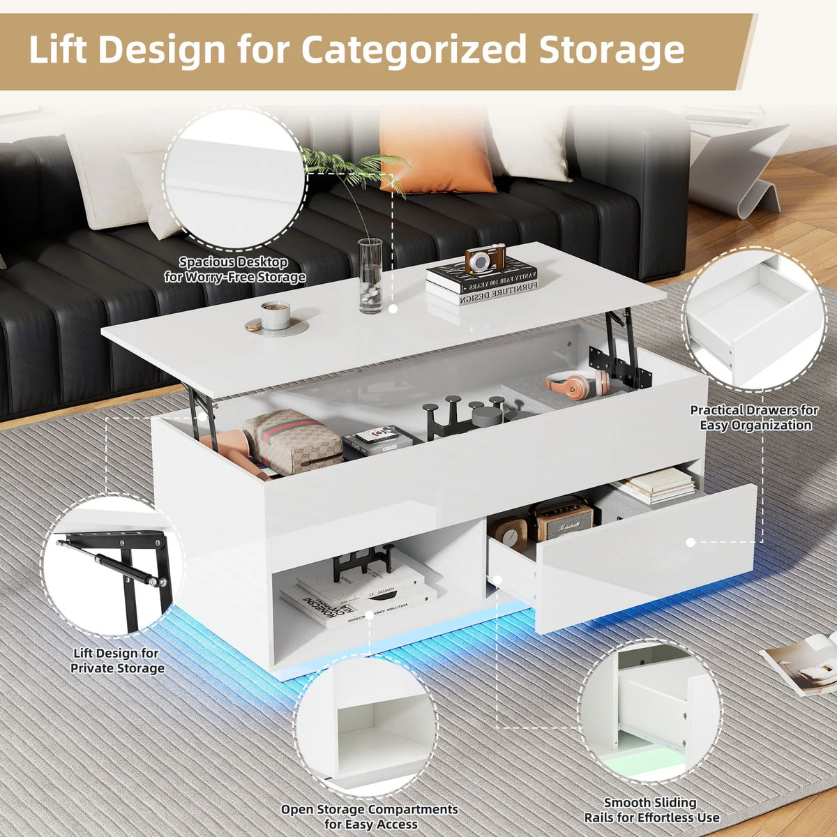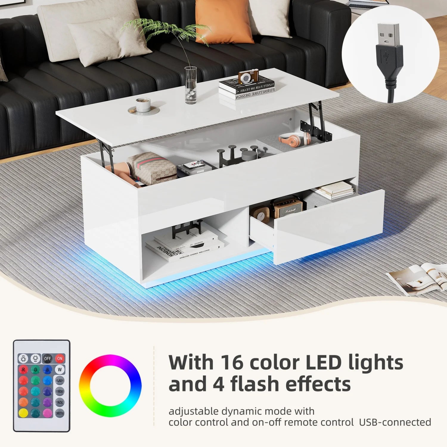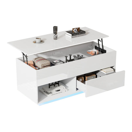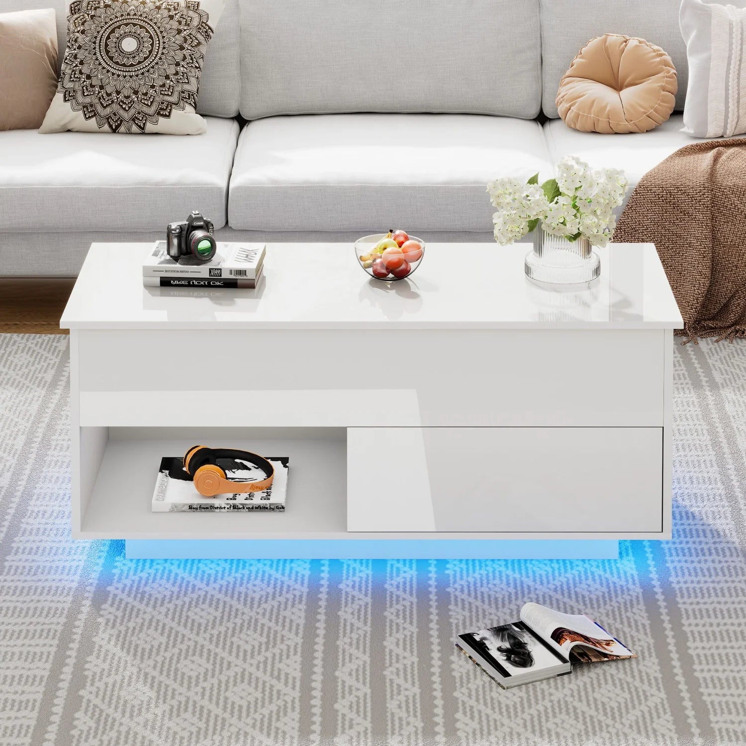 Masă de cafea cu finisaj lucios, cu capac ridicat, lumini LED și sertar