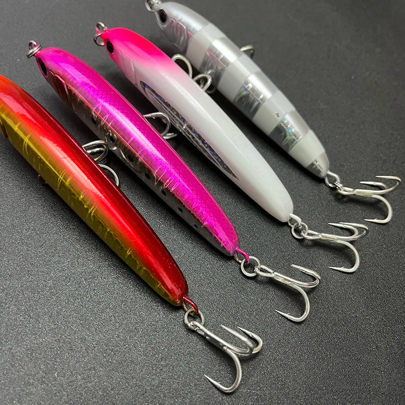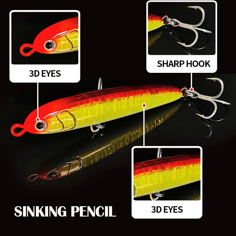 Îmbunătățește-ți experiența de pescuit cu momelile noastre 105mm Fast Sinking Pencil Fishing Lures. Proiectate pentru pescari serioși, aceste momeli artificiale cu laser sunt perfecte pentru pescuitul de ton și păstrăv marin. Momelile noastre dispun de ochi 3D și sunt disponibile în șapte culori vibrante pentru a atrage mai mulți pești.