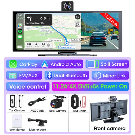 Cameră auto DVR 4K de 11,26 inch cu Dash Cam, CarPlay wireless și GPS