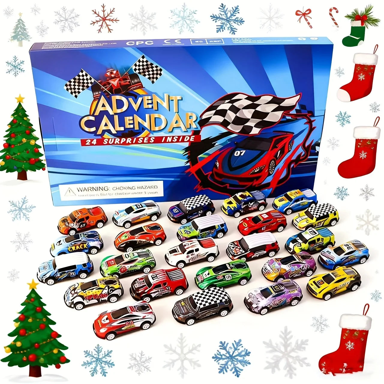Calendar de Crăciun cu Mașini de Curse cu 24 de Cadouri pentru Numărătoarea Inversă, Fabricat din Plastic, Temă Moș Crăciun
