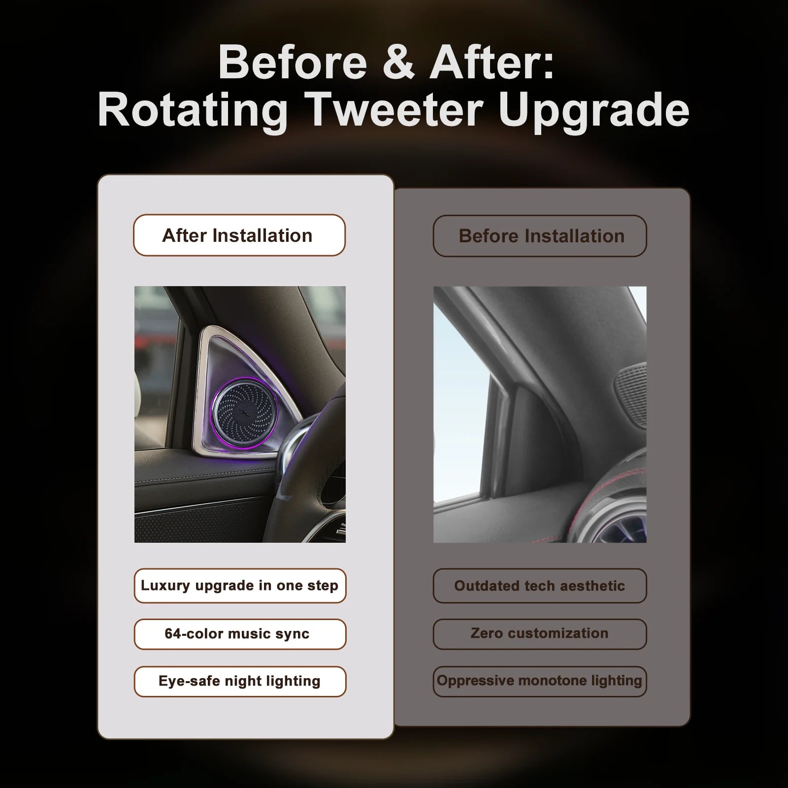 Iluminarea ambientală este mai mult decât un simplu spectacol — se sincronizează inteligent cu iluminarea originală a mașinii tale, oferind o potrivire perfectă a culorii și luminozității pentru a crea o atmosferă interioară coerentă. Împreună cu designul tweeter-ului rotativ 4D, obții o spatialitate și detalii audio îmbunătățite, în timp ce mișcarea rotativă adaugă un indiciu vizual dinamic care ridică vibrația generală de lux din interiorul vehiculului tău.