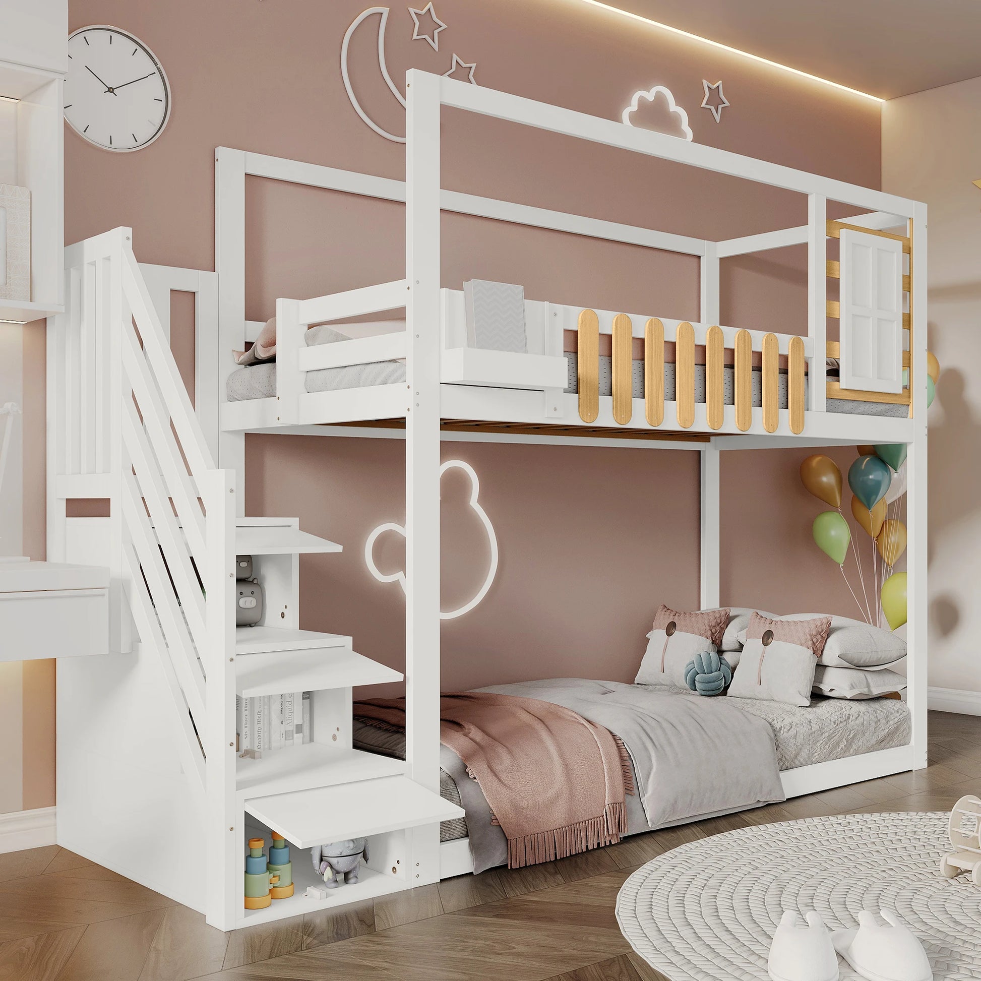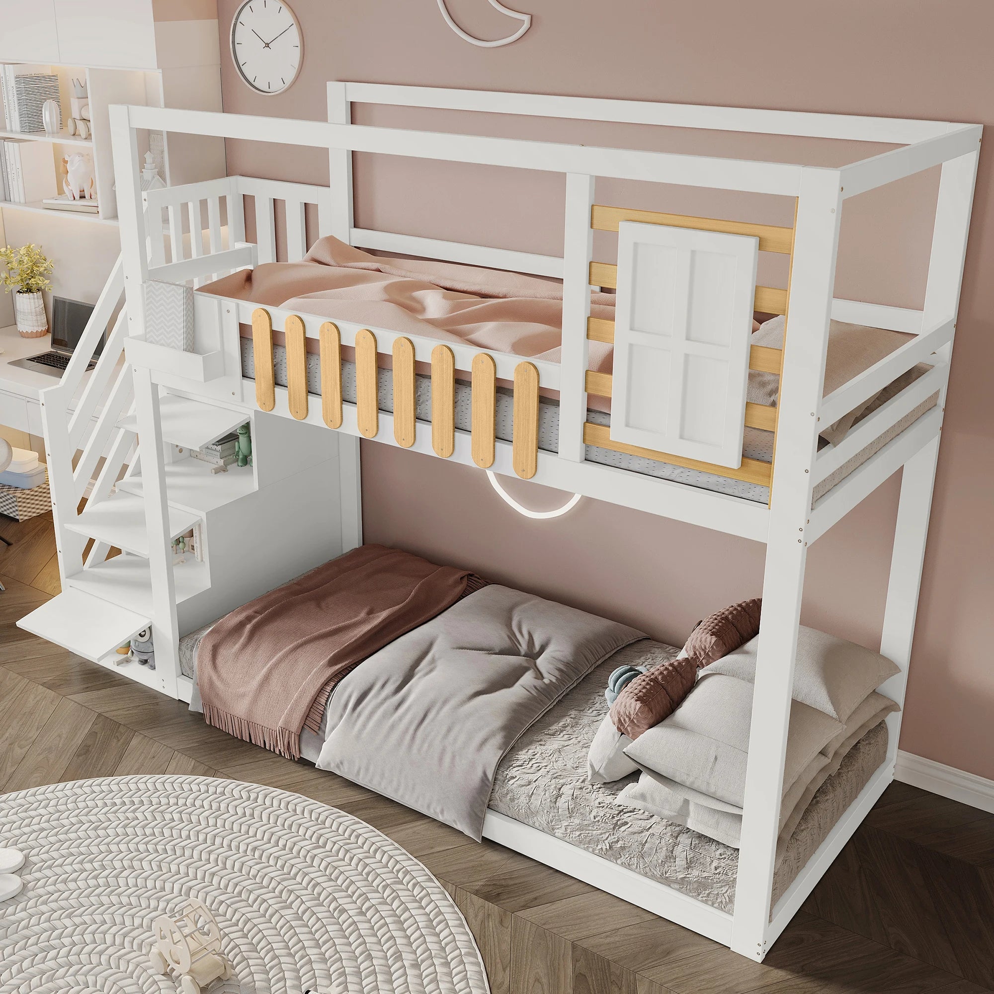 Îmbunătățiți spațiul de dormit al copilului dvs. cu Patul Supraetajat cu Scări, Poartă de Siguranță, Raft și Lemn de Pin 90x200. Acest pat supraetajat modern combină linii curate cu o construcție robustă din lemn de pin și MDF pentru a oferi un punct central sigur, durabil și elegant pentru orice dormitor sau cameră de oaspeți. Etajul superior este securizat prin patru balustrade laterale și un cadru consolidat, în timp ce scările integrate cu balustrade de siguranță oferă acces ușor și sigur. Dulapurile integrate în scări oferă spațiu convenabil pentru depozitarea cărților și jucăriilor, ajutând la menținerea ordinii fără a sacrifica spațiul. Finisajul alb și natural și designul în stil fereastră adaugă o notă atemporală și contemporană care se potrivește unei game largi de decoruri.