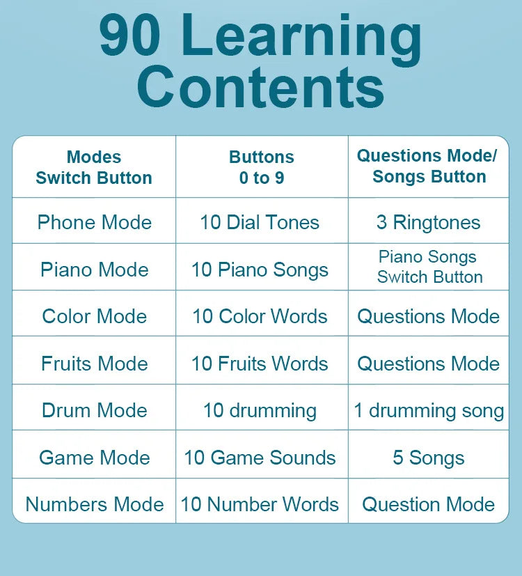 Această jucărie muzicală îmbunătățește implicarea senzorială, încurajează vorbirea timpurie și jocul de rol, și ajută copiii să învețe cauza și efectul prin lumini și sunete. Dimensiunea sa compactă și construcția durabilă o fac ideală pentru acasă, grădiniță sau călătorii.