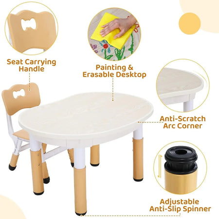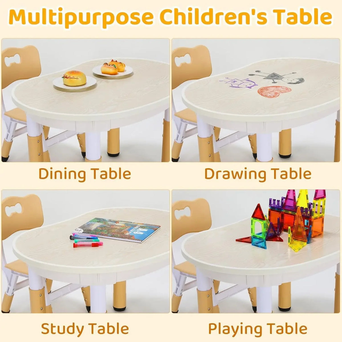 - Utilizare versatilă: ideal pentru teme, desen, mese și joacă colaborativă — forma de alună oferă o suprafață largă de lucru cu acces facil pentru copii.
