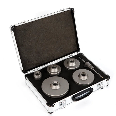 - Set 6 piese: burghie Ø40/68/80/100/120 mm, coadă SDS-Plus 110 mm, cutie de aluminiu