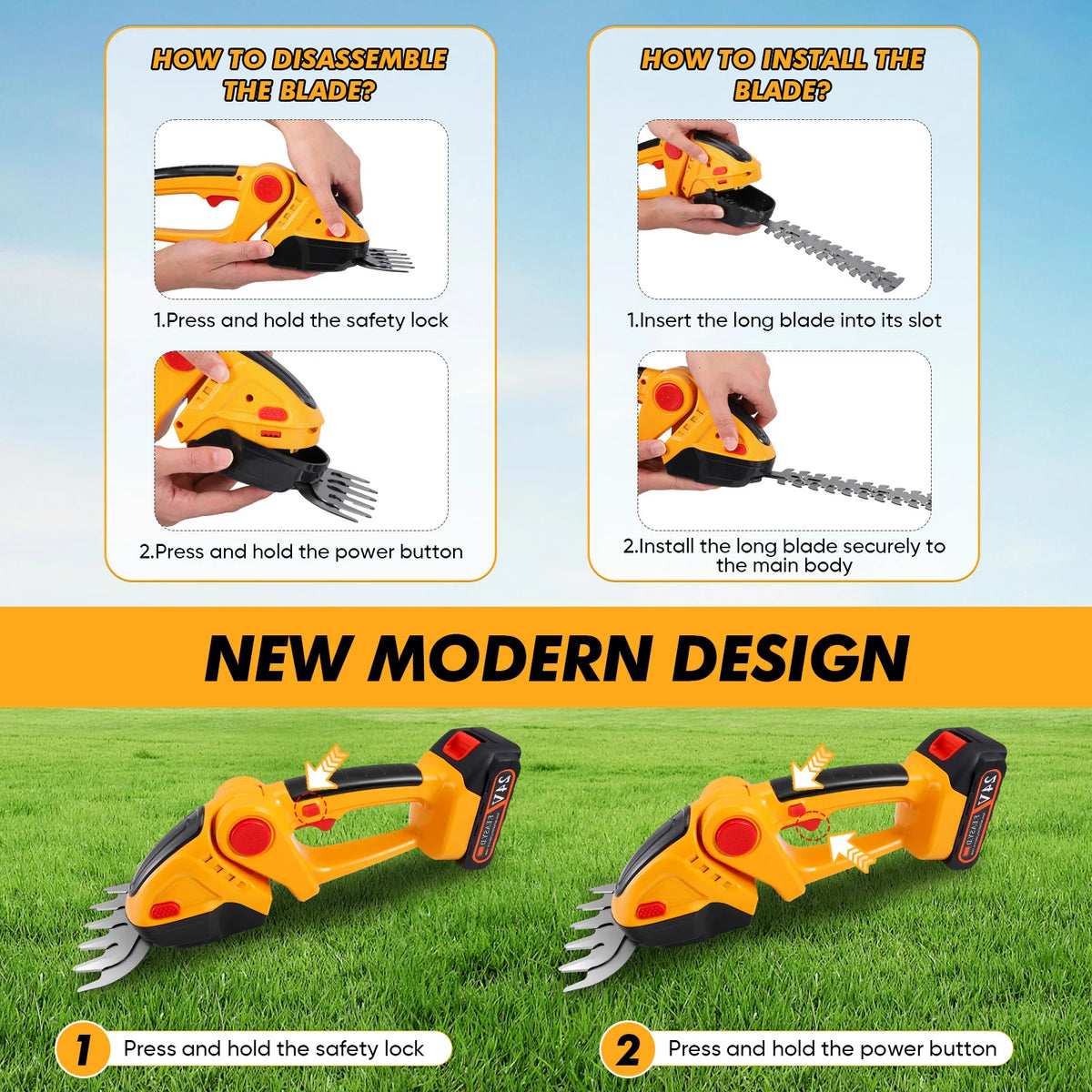 - Folosiți capul pivotant la 120° pentru a tăia vârfurile, părțile laterale și inferioare pentru un finisaj curat și uniform.