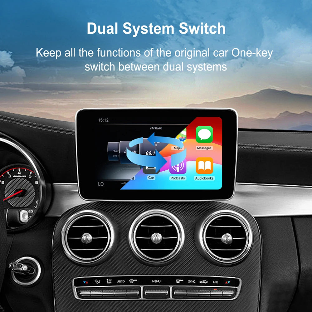 Îmbunătățiți unitatea principală de fabrică Mercedes-Benz NTG 5.0/NTG 5.1 cu adaptorul ANYFAR Mercedes Benz NTG 5.0 Wireless CarPlay Bluetooth 5.0. Proiectat pentru ecrane de 7.4", 8.4" și 12.3", acest modul plug-and-play aduce CarPlay wireless, Android Auto și Mirror Link în sistemul dumneavoastră existent fără cabluri invazive. Păstrați aspectul premium al interiorului mașinii dumneavoastră în timp ce obțineți conectivitate modernă, opțiuni de navigație și media care se integrează cu dispozitivul dumneavoastră iPhone sau Android.