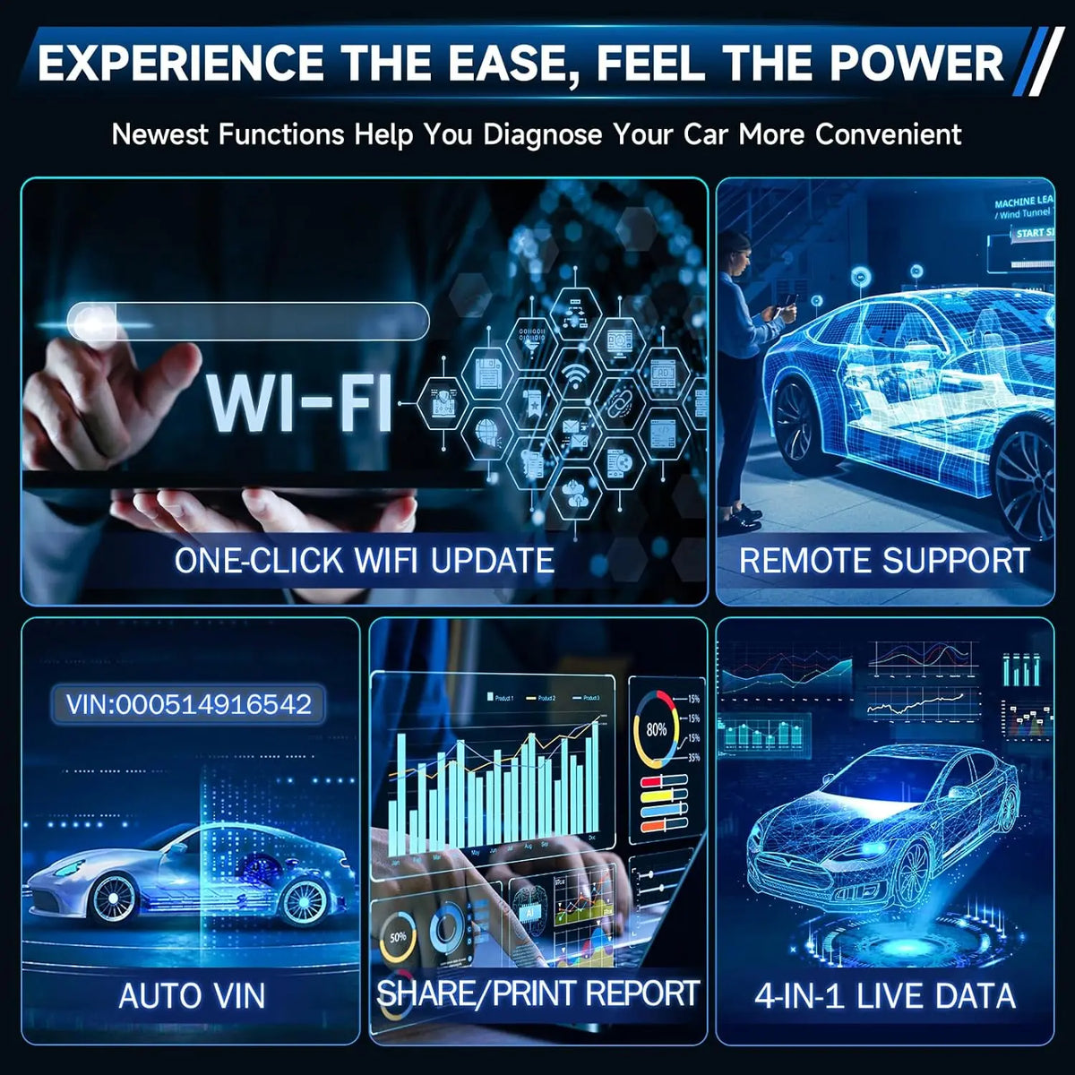 - Auto VIN (unde este suportat) accelerează configurarea, iar graficele de date live 4-în-1 permit comparații rapide, unul lângă altul, ale senzorilor pentru o diagnosticare precisă.