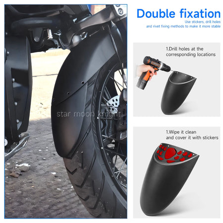 Îmbunătățește-ți BMW R1300GS 2023 cu această Extensie pentru Apărătoare Noroi Față, un Extensor durabil din ABS proiectat să ofere protecție de lungă durată împotriva stropirii. Fabricat din ABS de înaltă calitate, extinde aripa față pentru a devia noroiul, apa și resturile departe de evacuare, motorul inferior și radiator. Extenda Fenda urmează contururile motocicletei tale pentru un aspect curat și o protecție îmbunătățită pe drumuri umede și teren accidentat. Kitul include nituri din plastic pentru montare și o padă specială autoadezivă. Pentru o instalare cât mai stabilă, se recomandă puternic găurirea și utilizarea niturilor. Lungime extinsă: 140 mm (14 cm).