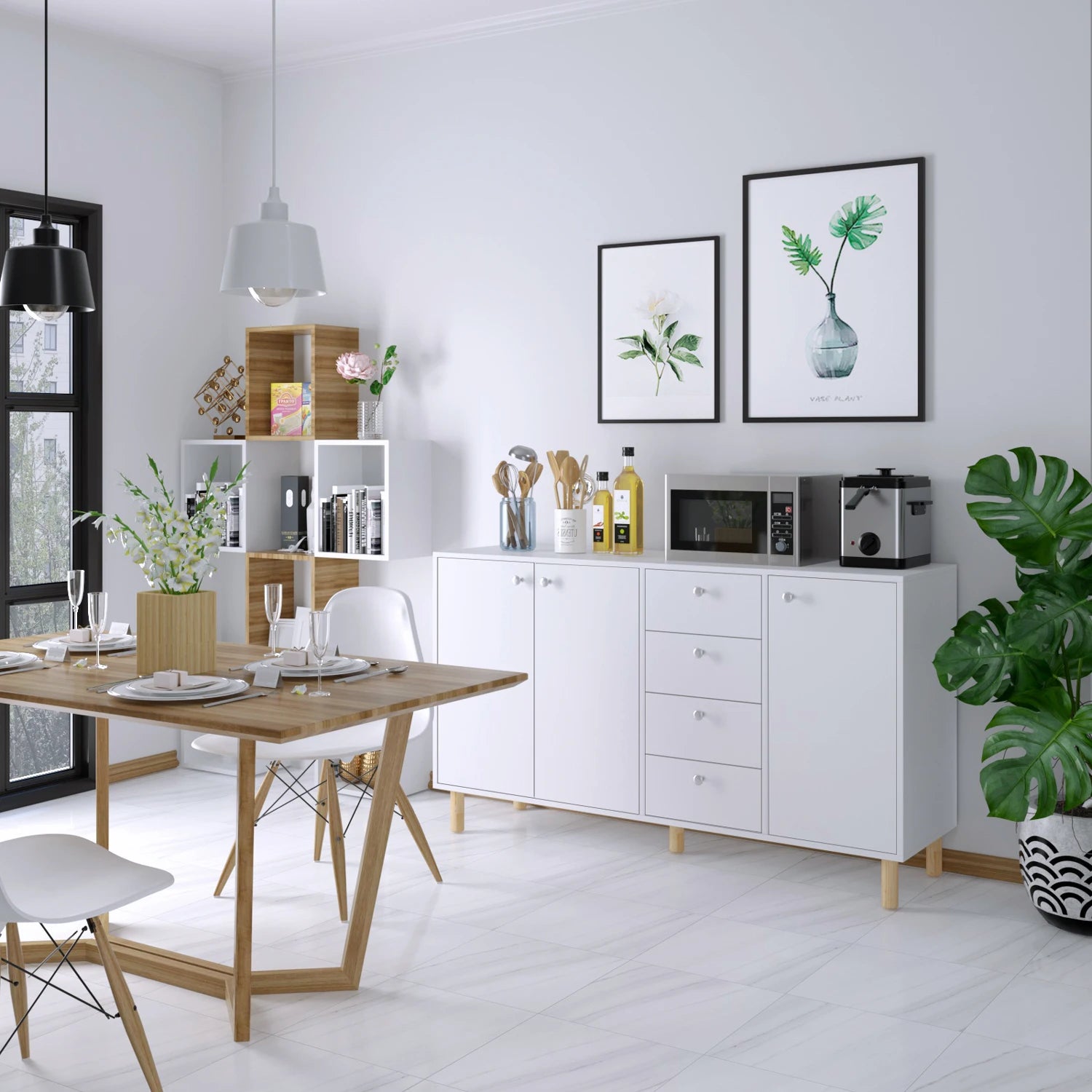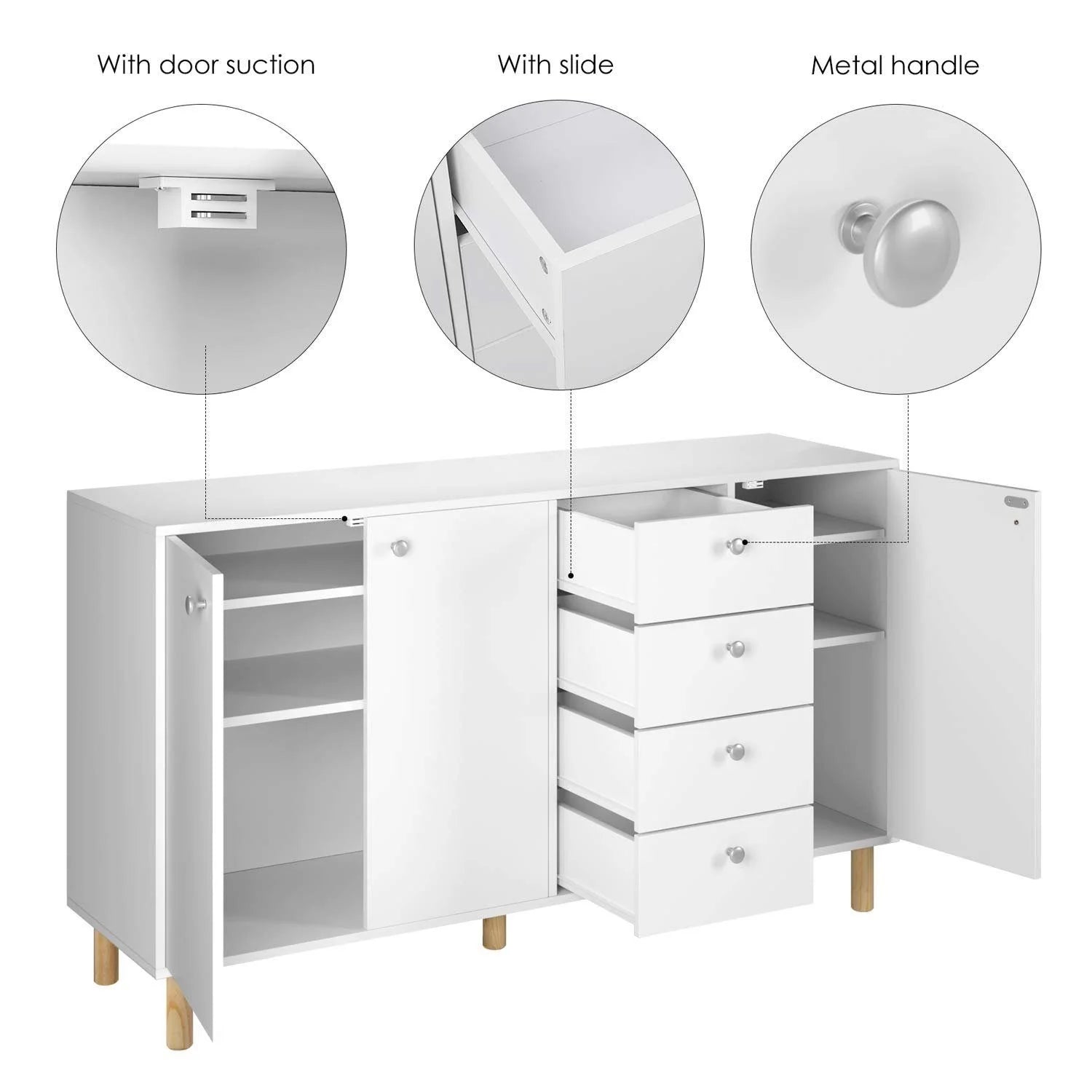 Bufetul de bucătărie Getone alb cu 3 uși și 4 sertare este o soluție de depozitare versatilă care aduce organizare și stil în orice spațiu. Realizat cu o bază robustă din placă aglomerată și un furnir alb rezistent la apă și zgârieturi, acest bufet combină o construcție durabilă cu linii curate, inspirate din designul european. Picioarele din lemn masiv de culoare naturală și mânerele din metal argintiu adaugă o notă de căldură și modernitate, în timp ce magneții ușilor mențin fiecare panou fixat sigur pentru o închidere ordonată și silențioasă.