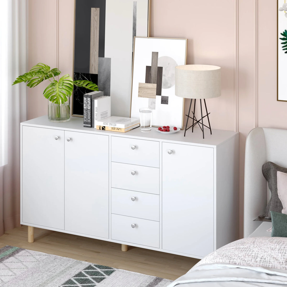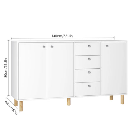 Versatil prin design, funcționează minunat ca bufet de bucătărie, spațiu de depozitare în sufragerie sau o completare elegantă pentru living sau dormitor. Suprafața generoasă de lucru este ideală pentru pregătirea meselor, expunere sau sarcini zilnice, în timp ce cele 3 uși și 4 sertare oferă un spațiu ascuns abundent. În spatele celor două uși ale dulapului, rafturile reglabile vă ajută să adaptați compartimentarea pentru vase, lenjerie sau articole de birou.