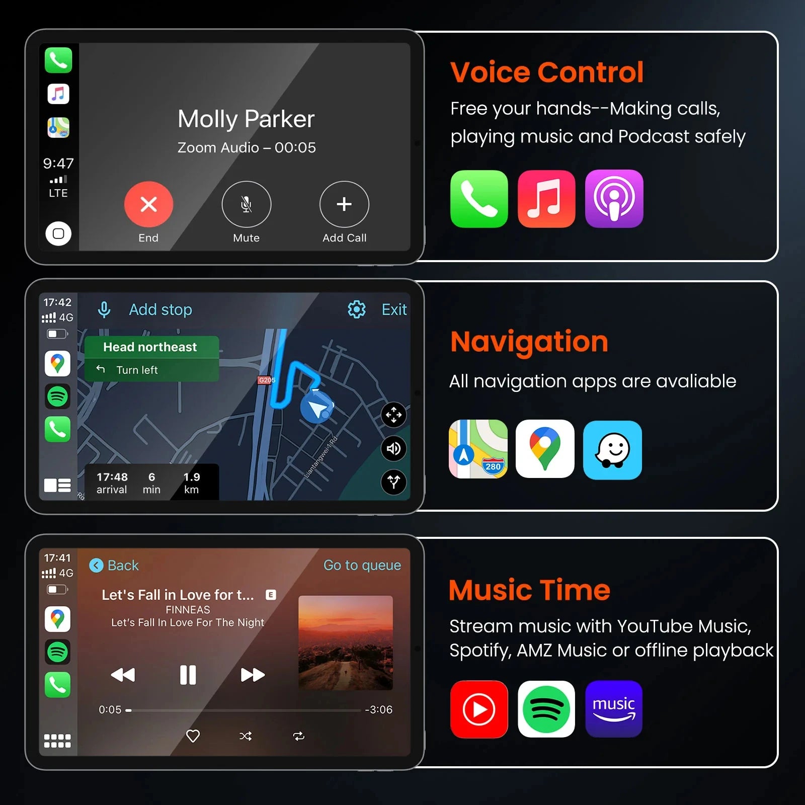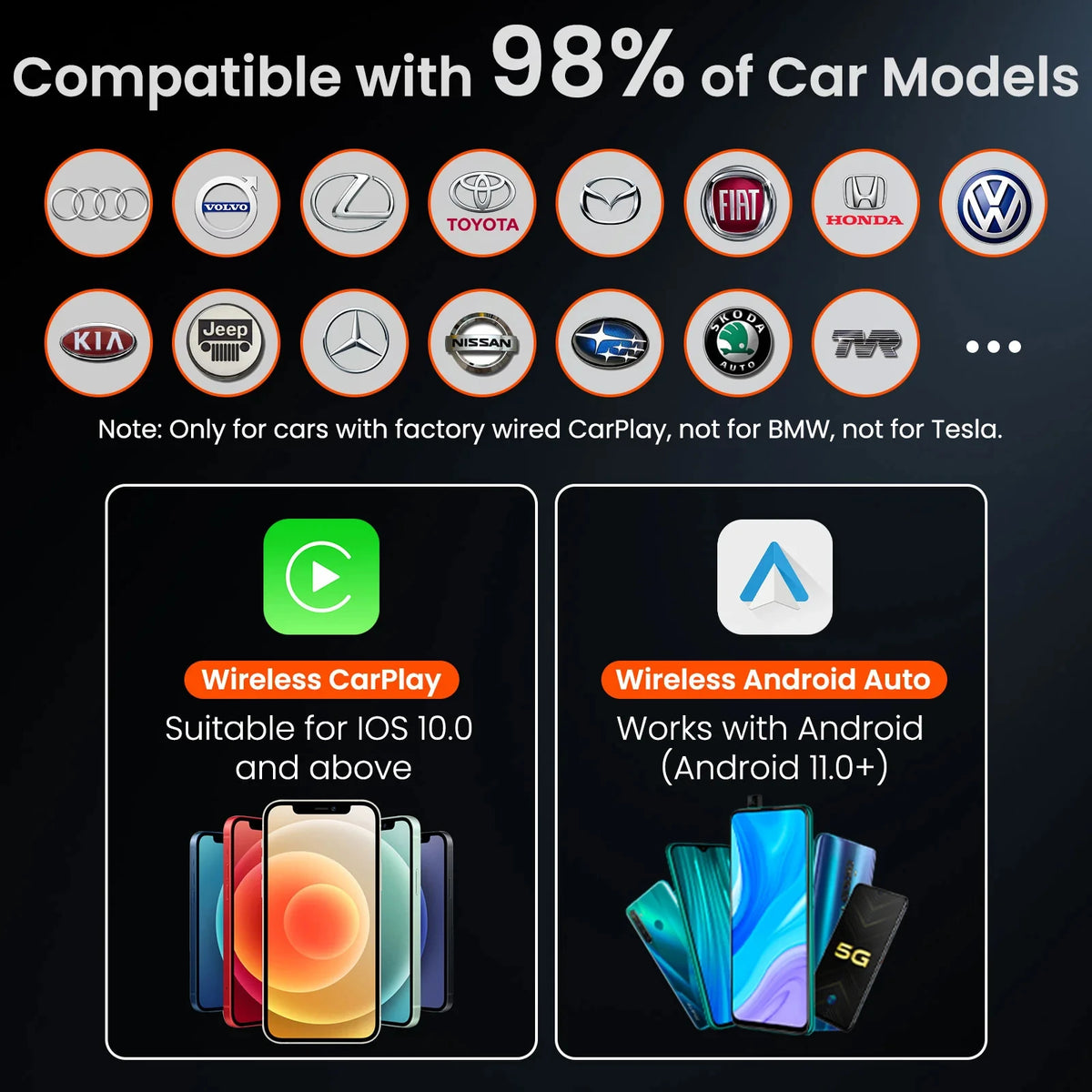 - Compatibilitate optimă: funcționează cu mașinile cu CarPlay/Android Auto cablate din fabrică care rulează Android 11+/iOS 12+; testați mai întâi CarPlay cablat dacă nu sunteți sigur.