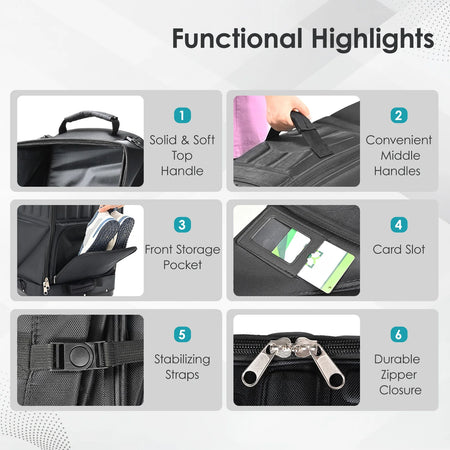 - Verificați politicile companiei aeriene privind bagajele supradimensionate; acest bagaj măsoară 38 × 30 × 130 cm când este utilizat.