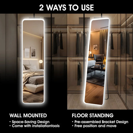 Trei moduri de culoare cu luminozitate reglabilă vă permit să adaptați lumina nevoilor dvs. Comutați între lumina galbenă de 3500K, caldă de 4500K și albă de 6500K cu o atingere rapidă și apăsați lung pentru a crește luminozitatea de la 10% la 100%. Controlul prin buton tactil este intuitiv și receptiv, făcând îngrijirea zilnică fără efort. Oglinda poate fi folosită ca piesă de podea, sprijinită de perete sau montată pe perete — cu accesorii de montare incluse pentru instalare sigură.