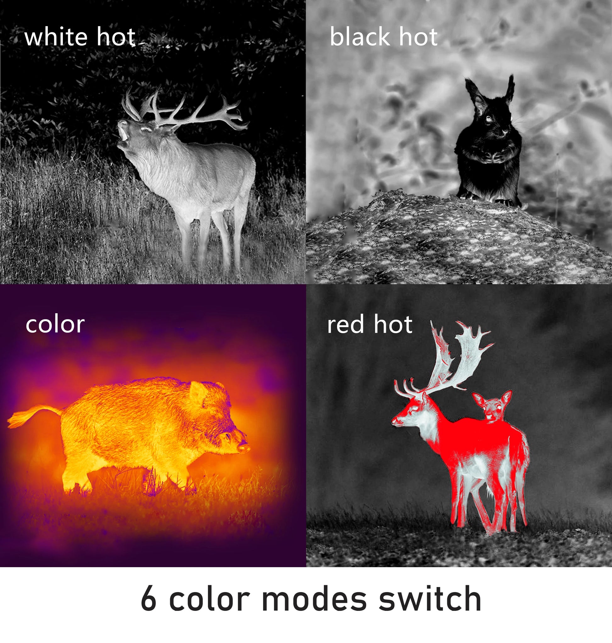 - Îmbunătățiți vânătoarea și urmărirea nocturnă cu multiple moduri de imagine (Alb Fierbinte, Roșu Fierbinte, Negru Fierbinte, Margine, Cer, Fier Fierbinte) pentru a se adapta la teren, vreme și contrastul țintei.