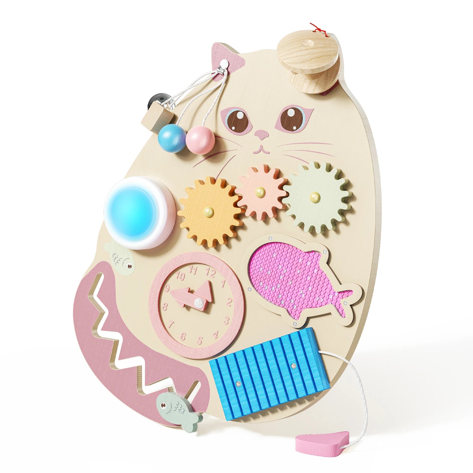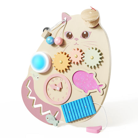 Descoperiți Panoul Montessori de activități — un panou senzorial din lemn conceput pentru a dezvolta abilitățile motrice fine și a menține mâinile mici ocupate. Perfect pentru copiii cu vârste între 3 și 6 ani, această jucărie în formă de pisică combină învățarea inspirată de Montessori cu explorarea jucăușă într-un format compact de 40 × 28 × 4 cm (aproximativ 900 g).