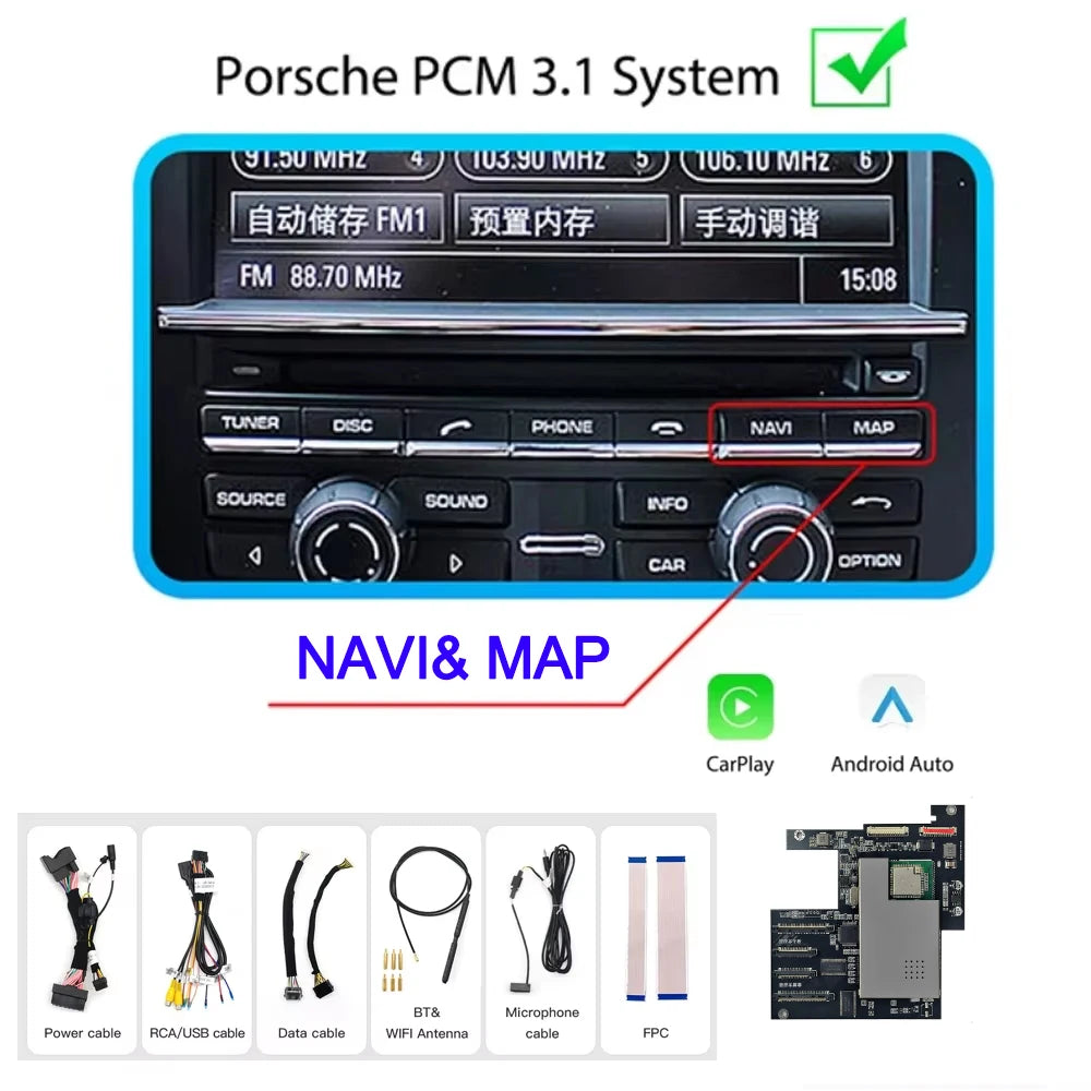 - Funcții unitate: Interfață video CarPlay pentru unitatea principală Porsche PCM3.1 cu ecran de 7”; WiFi încorporat 2.4G/5.8G; Bluetooth 5.0; suportă CarPlay, Android Auto, Mirror Link, unități USB Flash