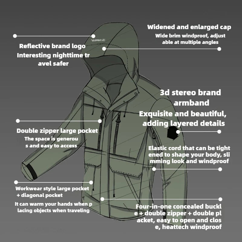 - Caracteristici cheie: Rezistentă la vânt, cu glugă, buzunare, fermoare