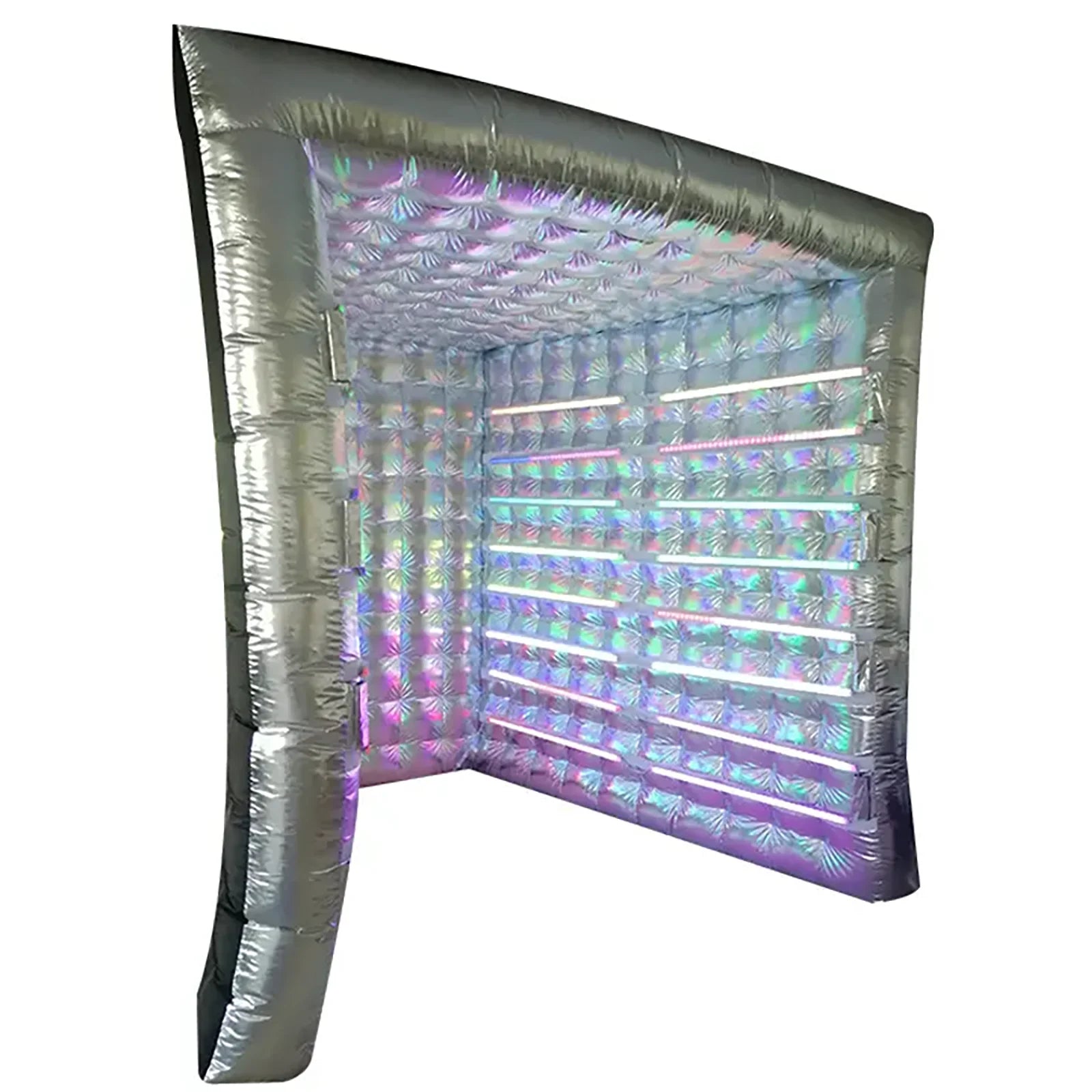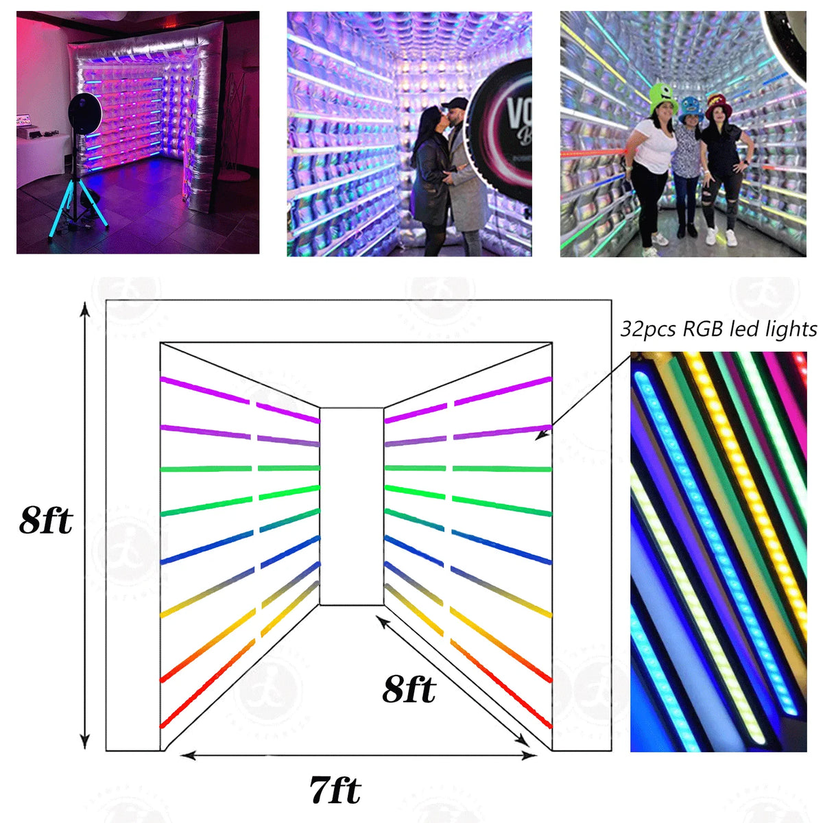 Proiectată pentru a acomoda grupuri și a permite fotografii largi și flatante, înălțimea de opt picioare și interiorul spațios fac ușor pentru oaspeți să adopte poză după poză. Lumini RGB încorporate pot schimba culorile pentru a se potrivi cu tema sau brandingul tău, creând fundaluri dinamice fără echipamente suplimentare.