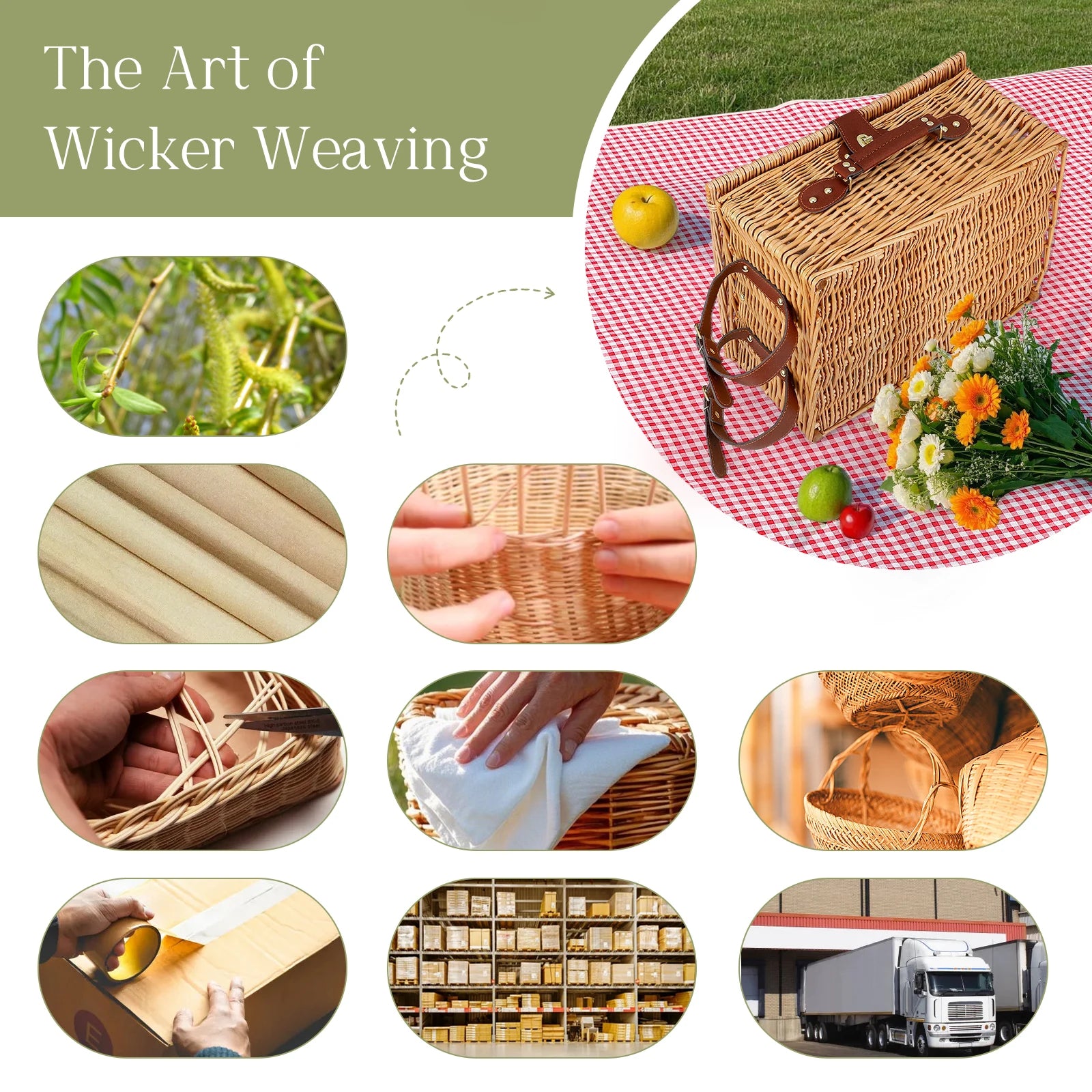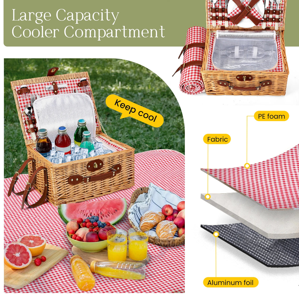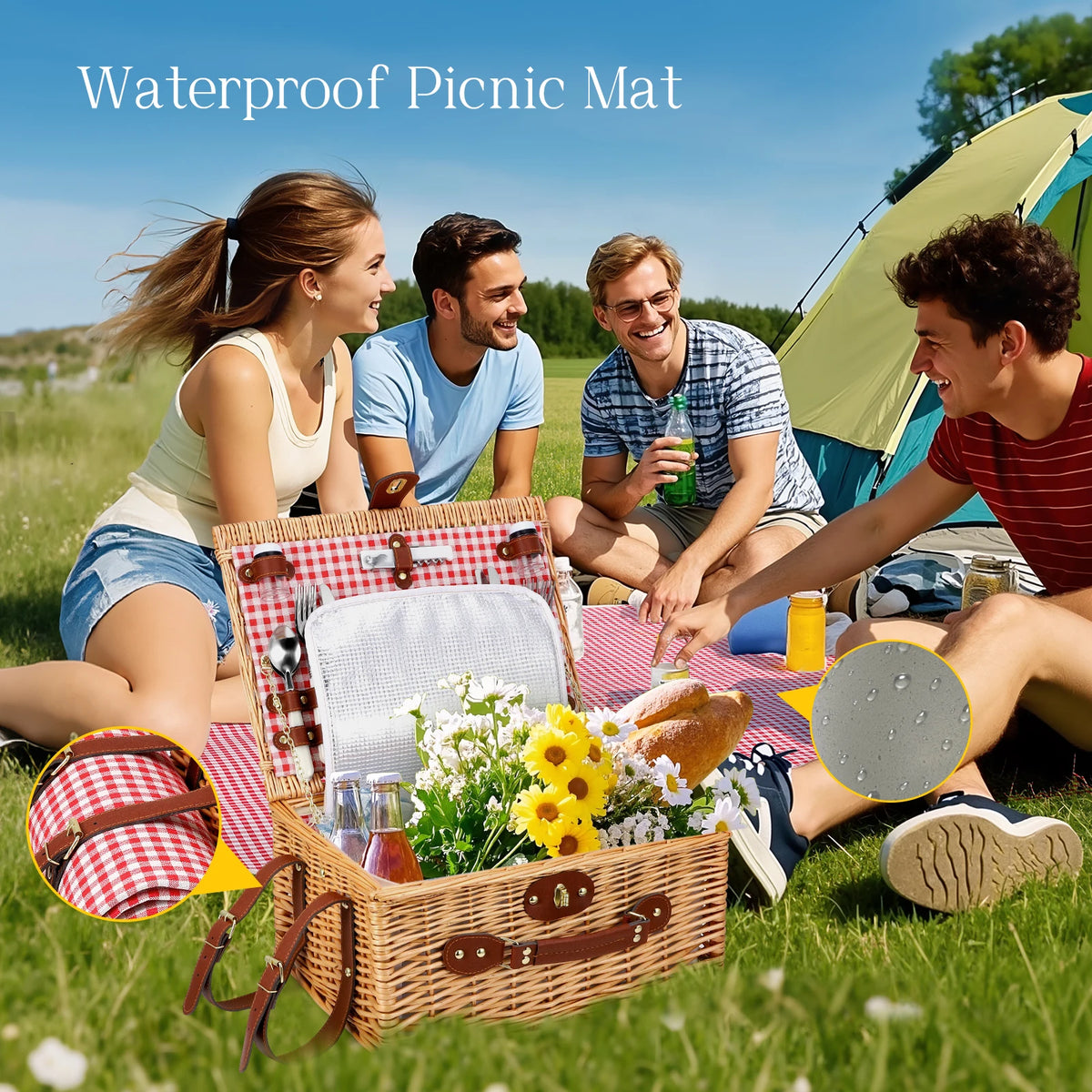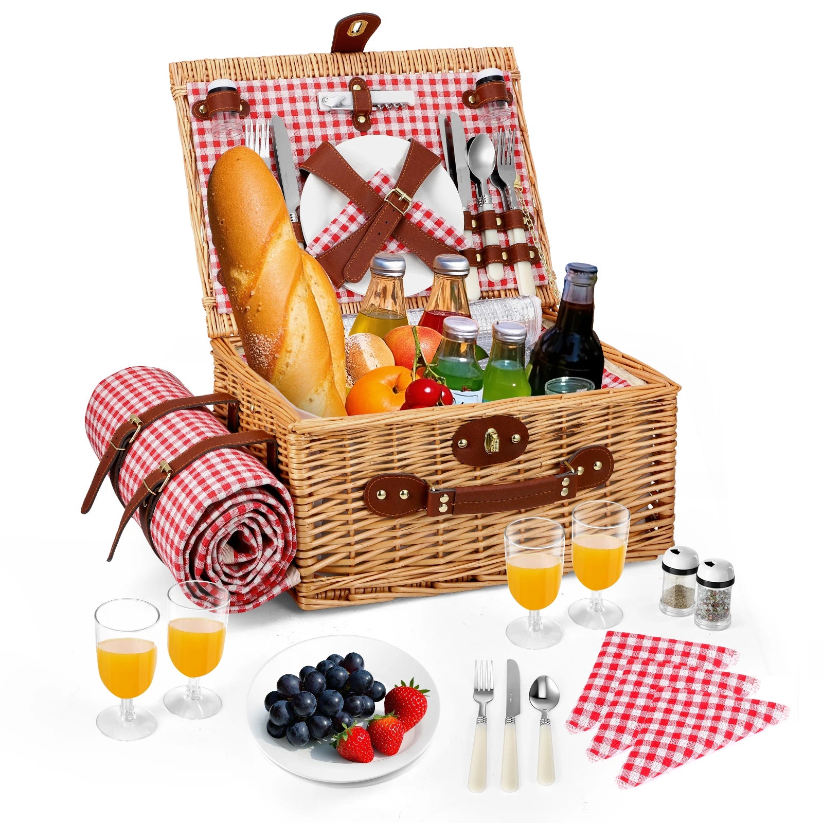 Coș de picnic din salcie făcut manual pentru patru persoane cu pătură și tacâmuri