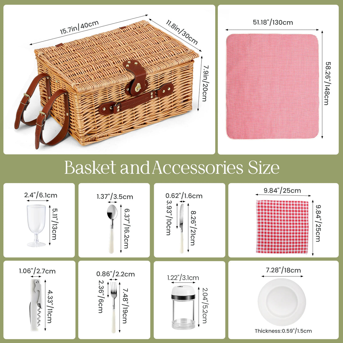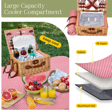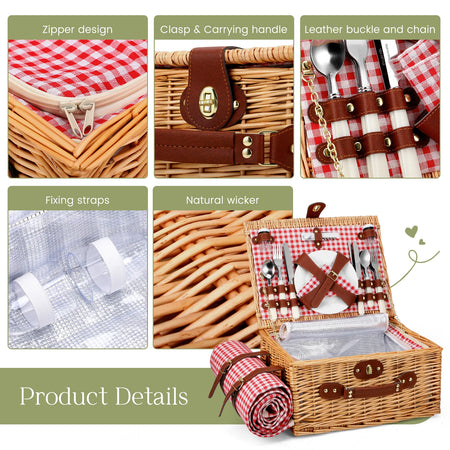 Conceput pentru comoditate, coșul dispune de un compartiment izolat pentru a menține mâncarea caldă sau băuturile reci, astfel încât să vă puteți bucura de arome proaspete oriunde ați merge. Un capac cu închidere cu două lanțuri și închizători din piele previne deschiderea accidentală în timpul transportului, în timp ce covorașul impermeabil asigură o suprafață curată și confortabilă la fiecare aventură în aer liber. Acest set este ideal pentru o întâlnire romantică, o ieșire în familie, o petrecere în aer liber, un concert, o excursie cu mașina sau o drumeție de camping—și reprezintă un cadou atent pentru aniversări, sărbători, Crăciun și Ziua Mamei.