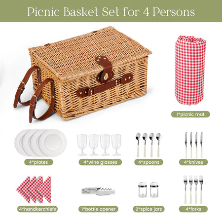 - Perfect pentru patru: Include patru seturi de tacâmuri din oțel inoxidabil (cuțit, furculiță, lingură), patru farfurii ceramice, patru pahare de vin și un set complet de picnic pentru o masă relaxantă în aer liber.
