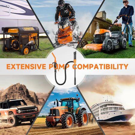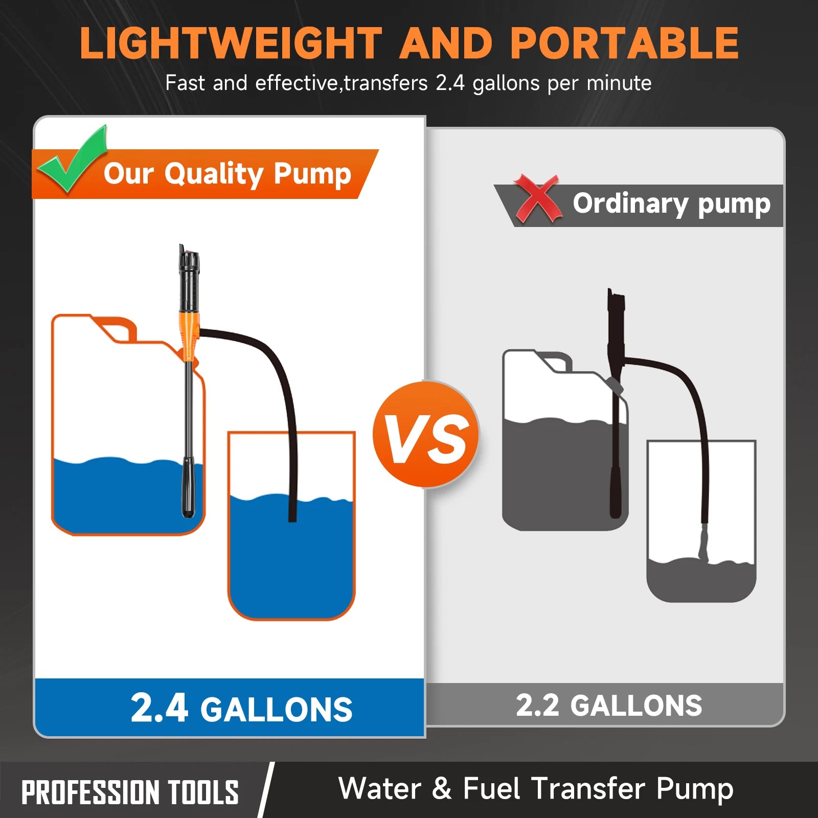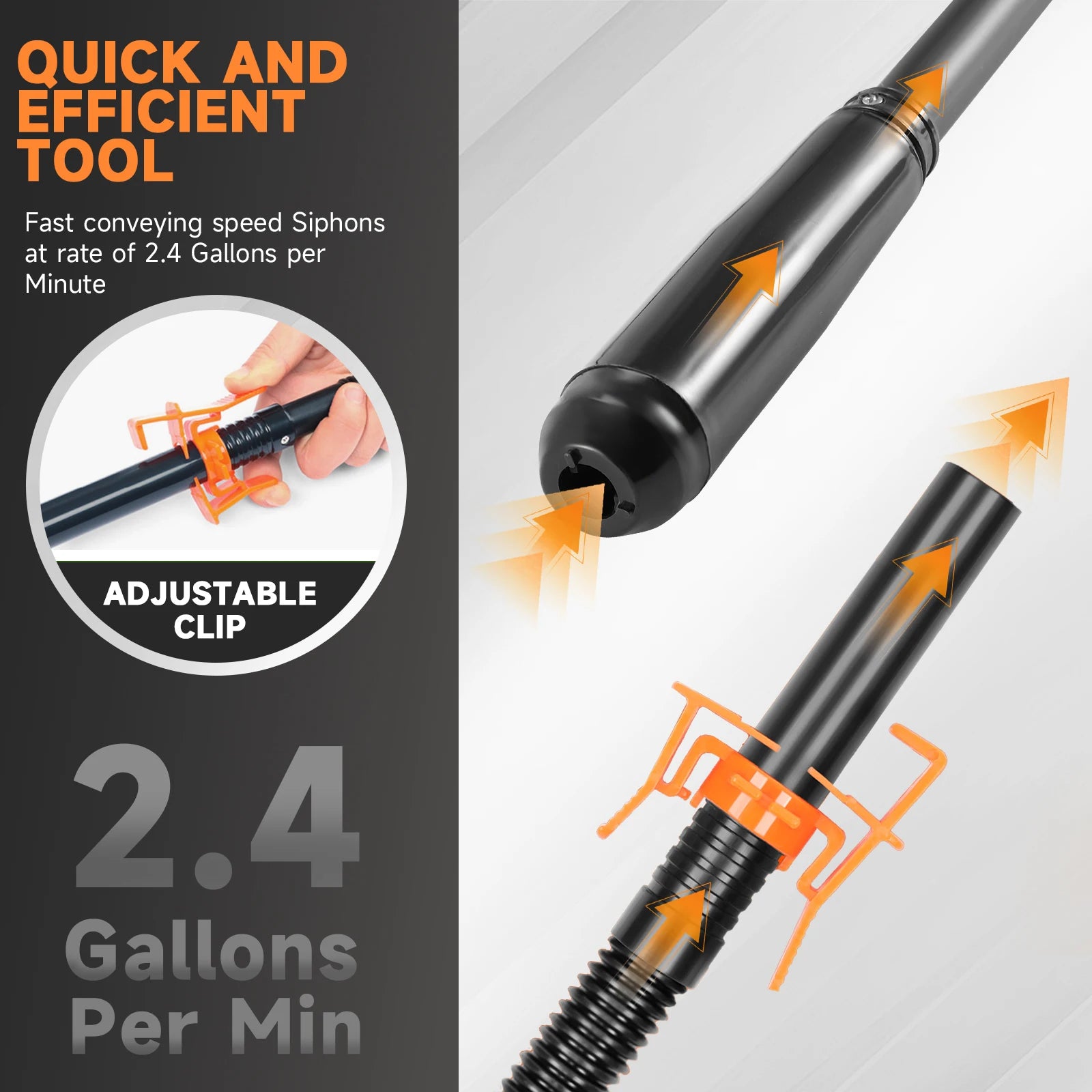 - Compatibilitate versatilă: potrivită pentru benzină, motorină, kerosen, apă și uleiuri ușoare; furtunul lung ajunge la recipiente și rezervoare largi.