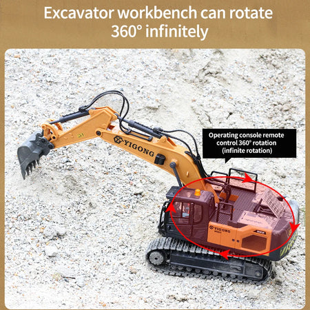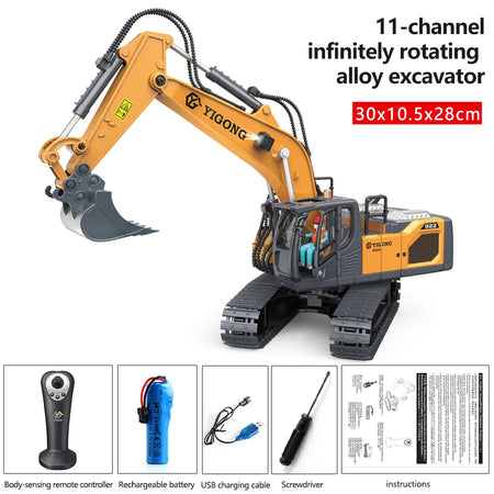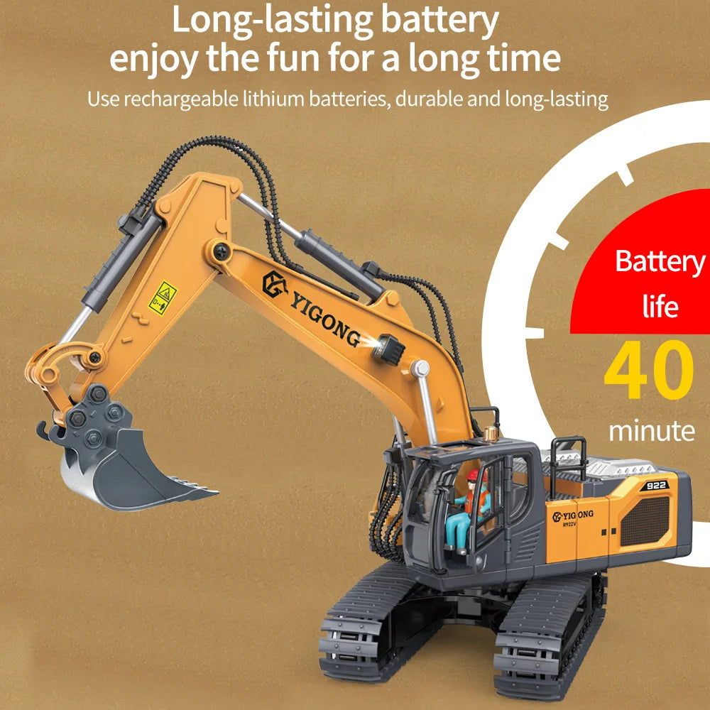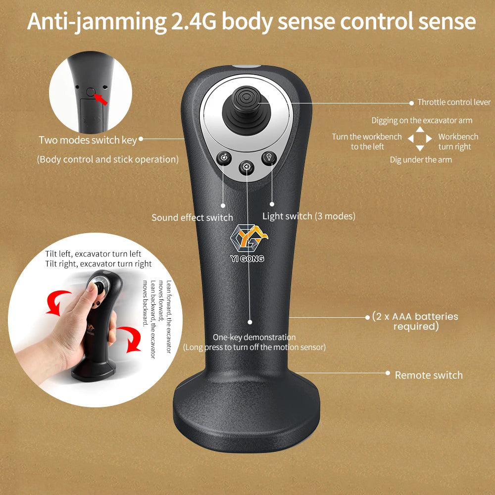 Caracteristicile cheie de acțiune includ un braț de săpat pentru săpat și descărcat, direcție înainte/înapoi și stânga/dreapta, și rotație de 360 de grade pe suprafața de lucru. Sistemul dual de control combină controlul inductiv cu telecomandă pe tijă și sincronizarea joystick-ului pentru o manevrare lină și precisă. Efectele realiste de iluminare și sunet adaugă imersiune, în timp ce o conexiune pe distanță lungă 2.4G vă menține în control până la aproximativ 30 de metri. Corpul este alimentat de o baterie litiu 18650 3.7V 1200mAh (inclusă), iar controlerul funcționează cu 2 baterii AAA (neincluse). O încărcare completă durează aproximativ 120 de minute și oferă aproximativ 40 de minute de joacă, făcându-l perfect pentru sesiuni extinse de construcție și operare.