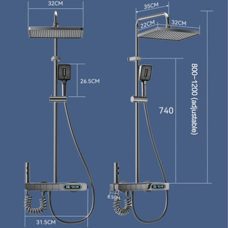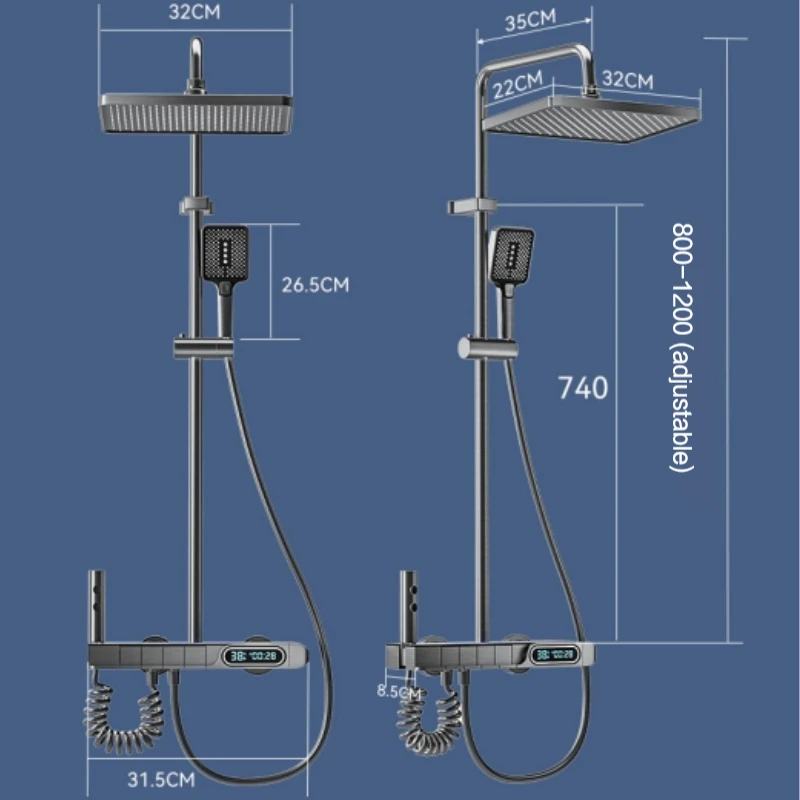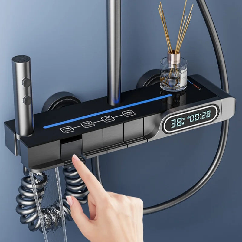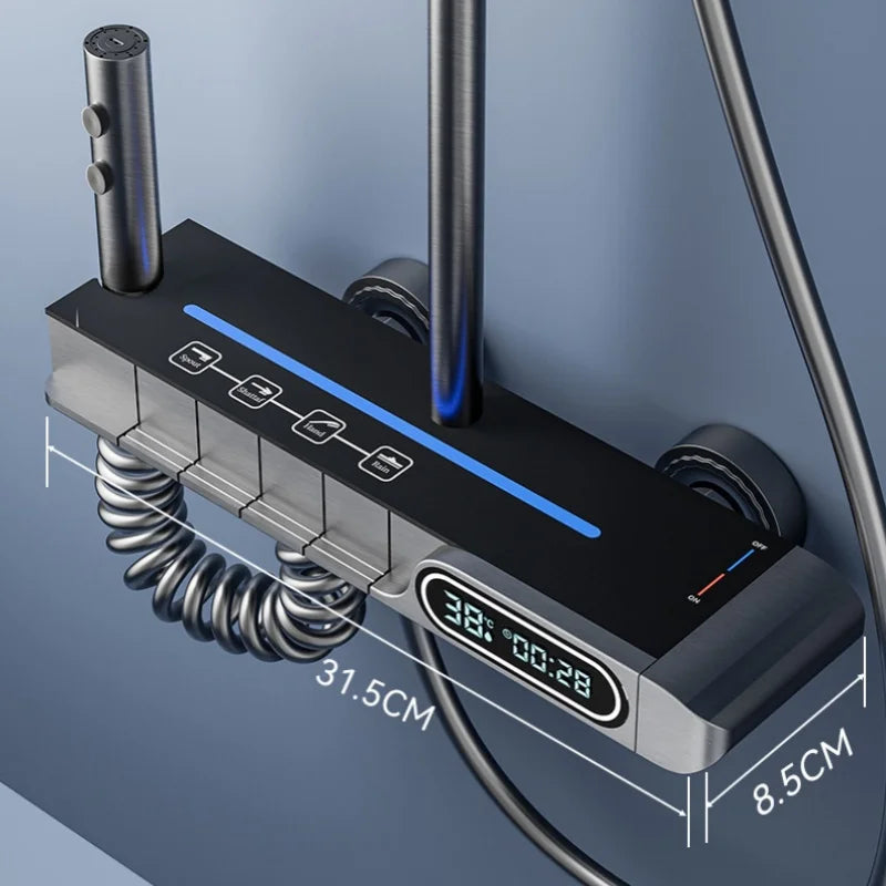 Set de duș cu afișaj de temperatură, montare pe perete, 4 funcții, cu butoane tip pian, duș cu ploaie, apă caldă și rece, set de robinet pentru cadă pentru baie