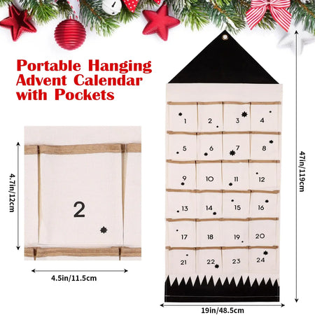 Calendar de Advent din pânză reutilizabil cu 24 de buzunare pentru numărătoarea inversă până la Crăciun, decor de perete agățat