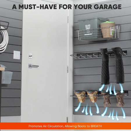 Păstrează-ți holul ordonat și pregătit pentru cizme cu suportul de perete pentru cizme Welly pentru 4 perechi. Acest suport interior este conceput pentru a maximiza spațiul și a proteja încălțămintea, menținând cizmele departe de podea, uscate și bine ventilate. Construit cu un design durabil, rezistent la rugină, susține în siguranță patru perechi de cizme — de la cizme Welly și de zăpadă la cizme de lucru și modele elegante din piele. Profilul său minimalist și stilat se potrivește cu orice decor și se instalează rapid, transformând holurile dezordonate în spații de depozitare organizate și accesibile.