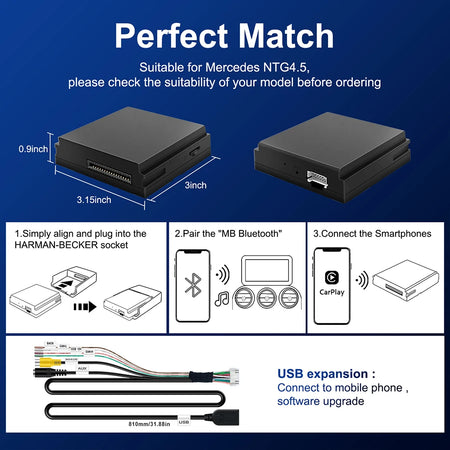 - 1 x kit de retrofit Wireless CarPlay/Android Auto Mercedes-Benz NTG 4.5 (port Harman Becker necesar)