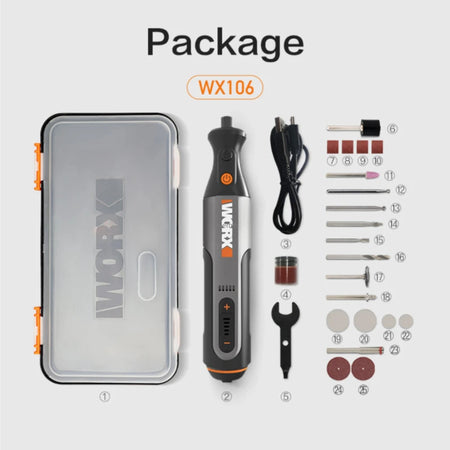 Indiferent dacă adăugați o notă personală la proiecte din lemn, metal, plastic sau hobby-uri, acest WX106 vă ajută să finalizați sarcinile rapid, cu mai puțin efort, datorită funcționării fără fir și performanței cu zgomot redus (aproximativ 60 dB fără sarcină; zgomotul real variază în funcție de sarcină). Este conceput pentru stabilitate — blocați cu o cheie pentru schimbări sigure de biți și un balans minim, cu o lamă din rășină de carburi de siliciu care oferă tăieturi curate și o durată lungă de viață pentru sarcinile de tăiere. Acest set include două baterii 14650 (1Ah fiecare) și un încărcător USB pentru alimentare convenabilă în deplasare, plus o cutie de unelte compactă pentru transport ușor.