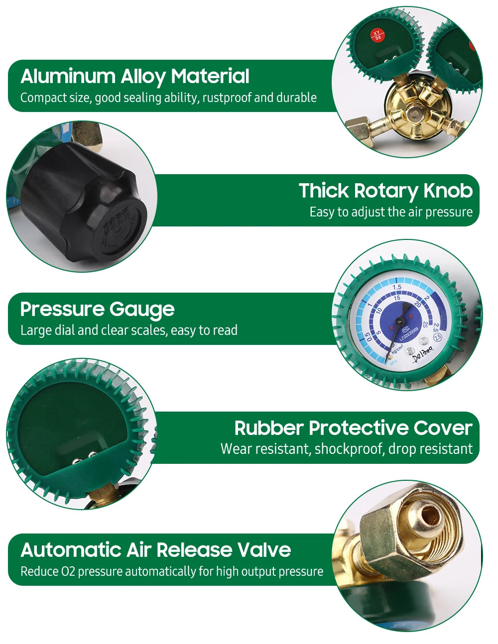 - Ușurința în utilizare: designul cu buton mare face ajustările de presiune rapide și precise, chiar și atunci când se poartă mănuși.