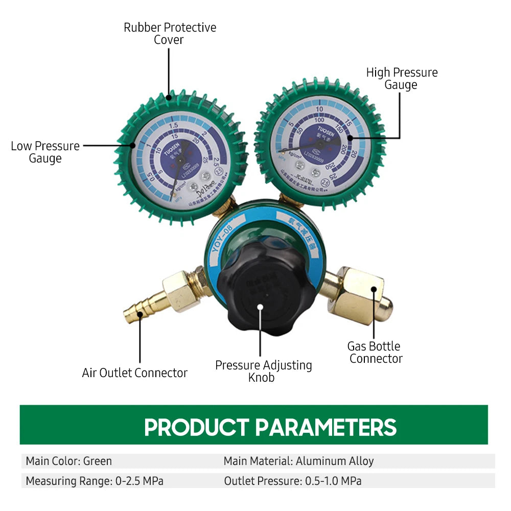 Regulatorul de presiune a oxigenului YQY08 este o soluție robustă, de grad industrial, concepută pentru decompresia sigură și eficientă a oxigenului. Fabricat dintr-un aliaj de aluminiu durabil și finisat într-o nuanță verde recognoscibilă, acesta oferă dimensiuni compacte, etanșare excelentă, rezistență la rugină și fiabilitate de lungă durată. Un ventil automat de eliberare a aerului reduce automat presiunea O2 atunci când presiunea de ieșire este prea mare, protejând echipamentele și operatorii în medii solicitante. Butonul mare rotativ oferă ajustări netede și precise, în timp ce manometrul acoperit cu cauciuc, dotat cu un cadran mare, asigură o citire ușoară. Ideal pentru sistemele industriale de oxigen, acest regulator oferă o presiune de ieșire de 0.5–1.0 MPa dintr-un interval de măsurare de 0–2.5 MPa. Certificat CE și fabricat de meterk (Model YQY-08) în China continentală, acesta combină siguranța, performanța și valoarea pentru utilizare zilnică.