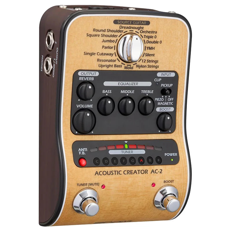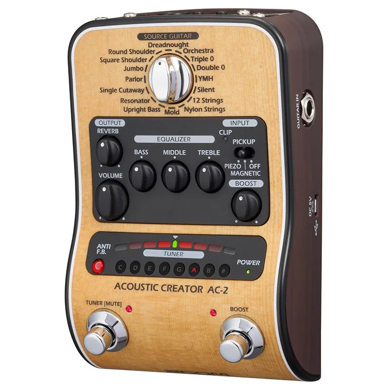 AC-2 este ideal pentru chitariști, vocaliști și ansambluri acustice care au nevoie de un ton fiabil, control intuitiv și rutare portabilă. Restaurarea tonului ajută la prevenirea durității adesea produse de pickup-urile piezo, în timp ce EQ-ul și reverb-ul integrate îți permit să compensezi pentru acustica camerei și preferințele personale. Cu efecte variate pentru a-ți sculpta semnalul și o conexiune USB pentru fluxuri de lucru moderne de înregistrare, AC-2 îți menține concentrarea pe interpretare, nu pe configurarea echipamentului.