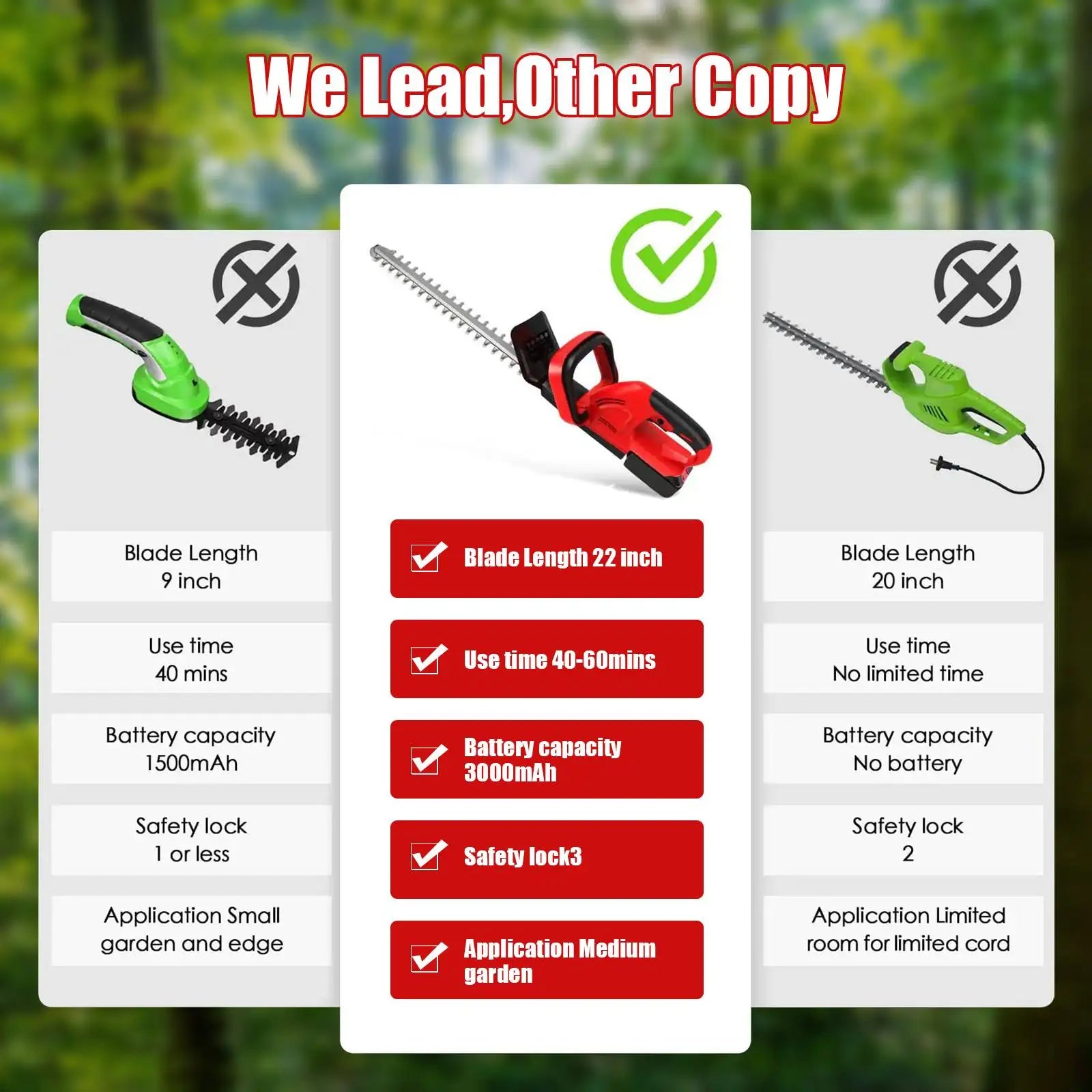 Легкий аккумуляторный кусторез, разработанный для точной и эффективной обрезки с 22-дюймовым двусторонним лезвием и долговечным аккумулятором 3.0Ah для беспроводного удобства.