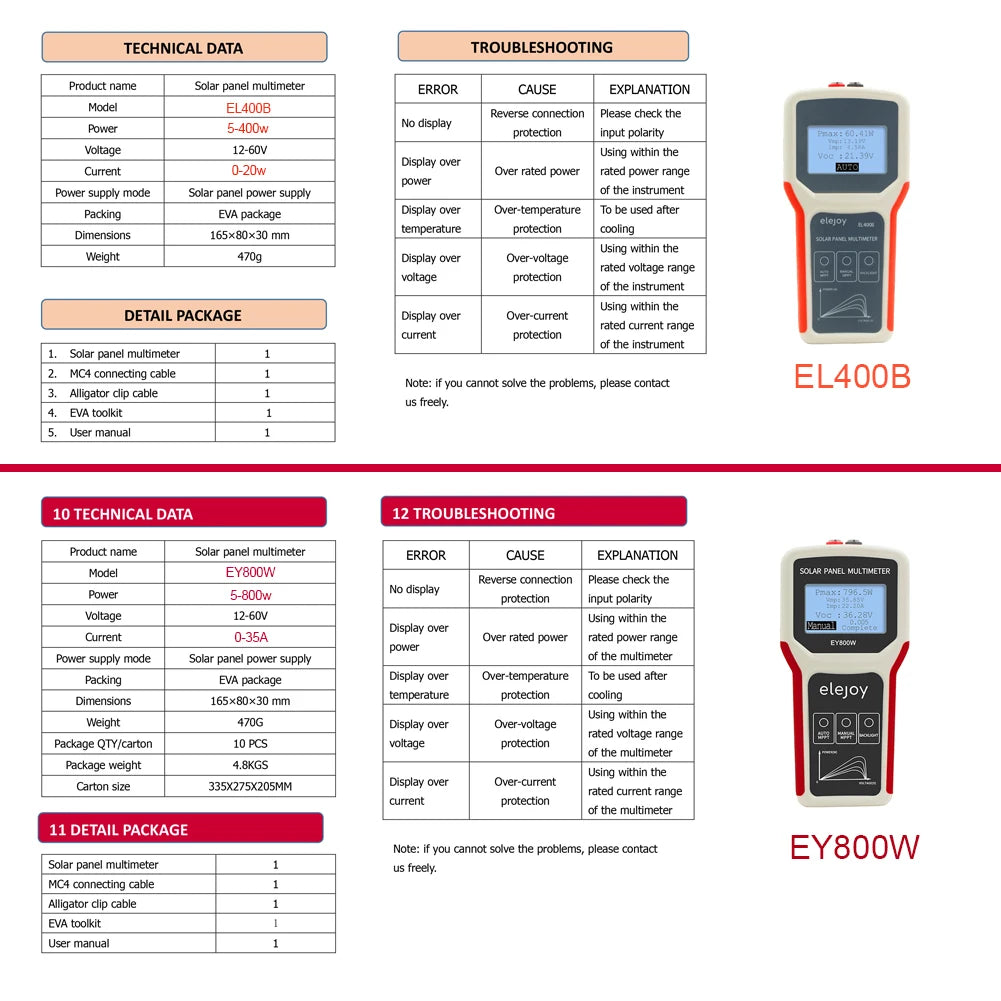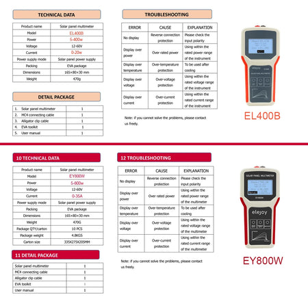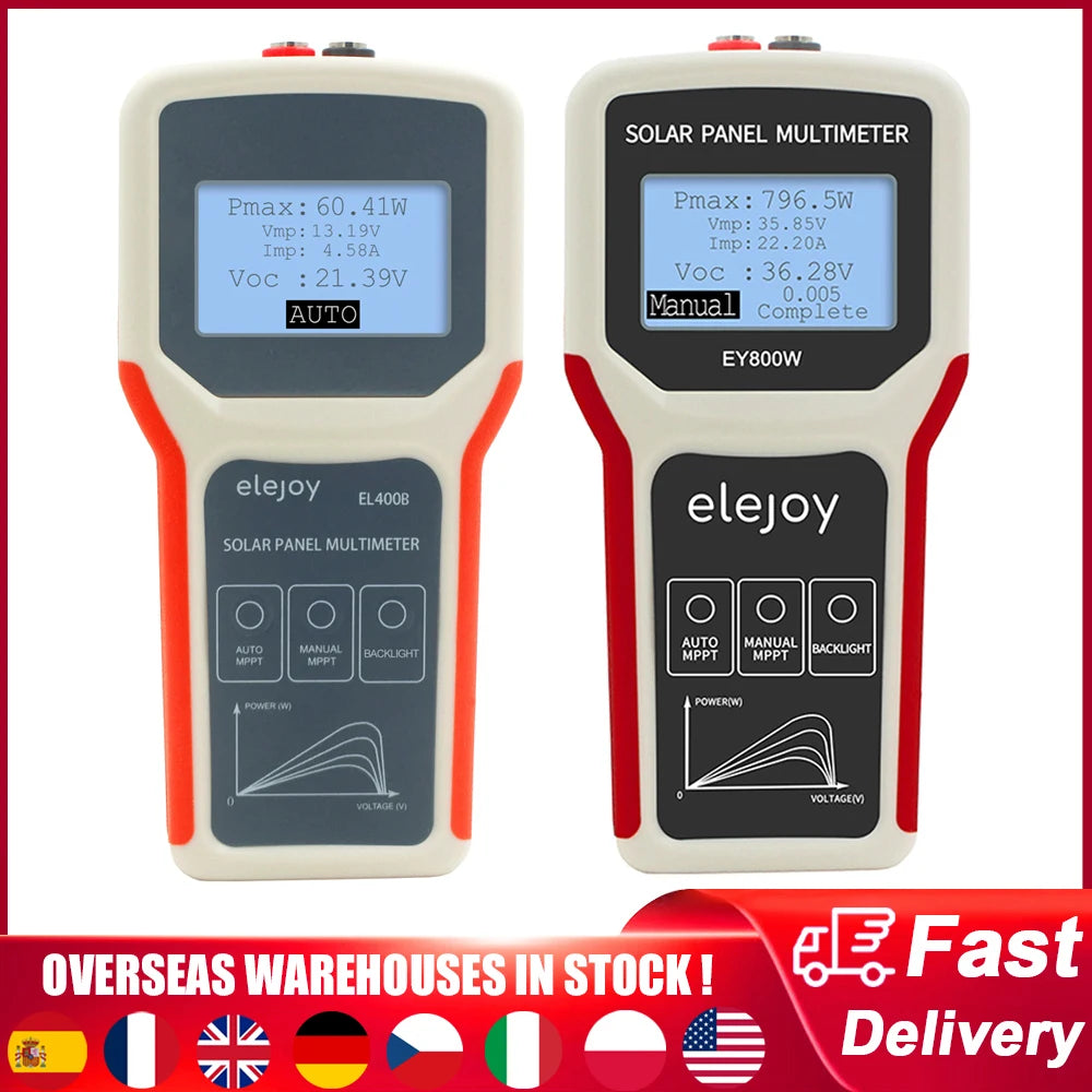 Выберите между двумя моделями, чтобы соответствовать вашим потребностям: EL400B (0.1–400 W, 0–20 A) и EY800W (5–800 W, 0–35 A), обе работают от 12–60 V. Устройство использует солнечные панели в качестве источника питания, предлагая энергосберегающий подход, который позволяет тестированию быть независимым от внешней электроэнергии. Функции включают автоматическое обнаружение MPPT для автоматической настройки интервалов, ручное обнаружение MPPT для целевых сканирований MPPT, большой подсвечиваемый ЖК-дисплей для четких показаний и встроенные защиты (перенапряжение, перегрев, превышение тока и превышение мощности) для безопасной работы в различных условиях. С легким, портативным форм-фактором 165 × 80 × 30 мм и сертифицированным дизайном CE, он готов к использованию в полевых условиях и тестированию на производственном этаже.