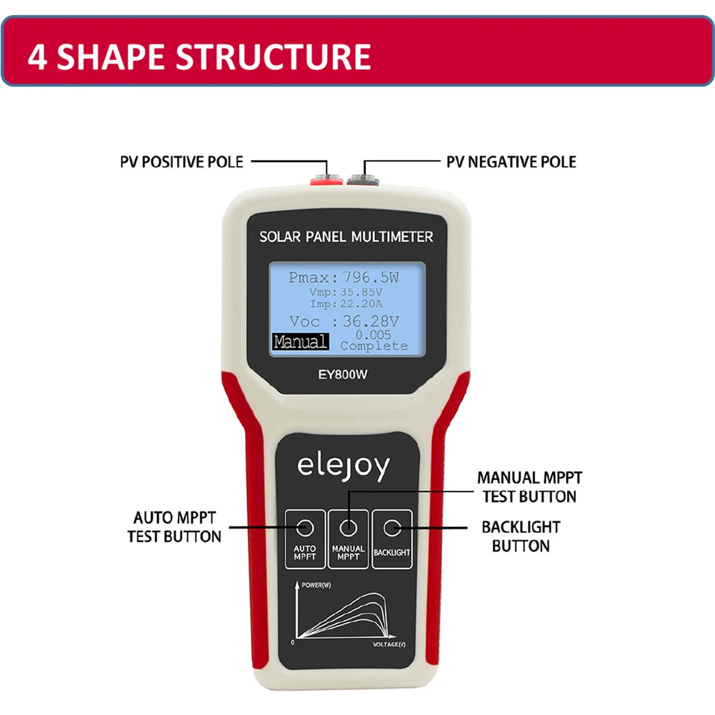 Познакомьтесь с 400W 800W солнечным панельным источником питания, мультиметром и тестером MPPT, компактным солнечным тестовым помощником, предназначенным для легкой проверки производительности солнечных панелей. Он измеряет напряжение на холостом ходу в реальном времени и автоматически отслеживает точку максимальной мощности (MPPT), чтобы оптимизировать выход панели, не потребляя энергию из вашей сети. Это делает его идеальным для производителей солнечных панелей, дистрибьюторов, установщиков и энтузиастов, которые хотят быстро и точно диагностировать мощность в пути.