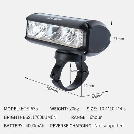 Познакомьтесь с велосипедной фарой 1700Lm с USB-зарядкой, надежным решением для MTB и шоссейного велоспорта. Благодаря прочному корпусу из алюминиевого сплава эта фара обеспечивает яркое и четкое освещение ночью или в условиях низкой освещенности, помогая вам видеть препятствия впереди и быть заметным для других на дороге.