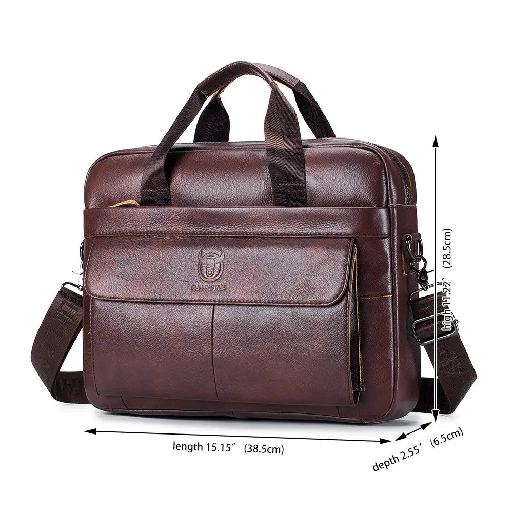 Познакомьтесь с портфелем-мессенджером Bullcaptain из натуральной кожи, премиальной сумкой для ноутбука 14 дюймов, созданной для современного профессионала. Изготовленный из кожи первого слоя коровы с солидным, сдержанным видом, этот портфель сочетает классический китайский стиль с прочной практичностью. Он надежно хранит ваш 14-дюймовый ноутбук и документы формата A4, организует их и облегчает переноску — от ежедневных поездок до важных встреч.