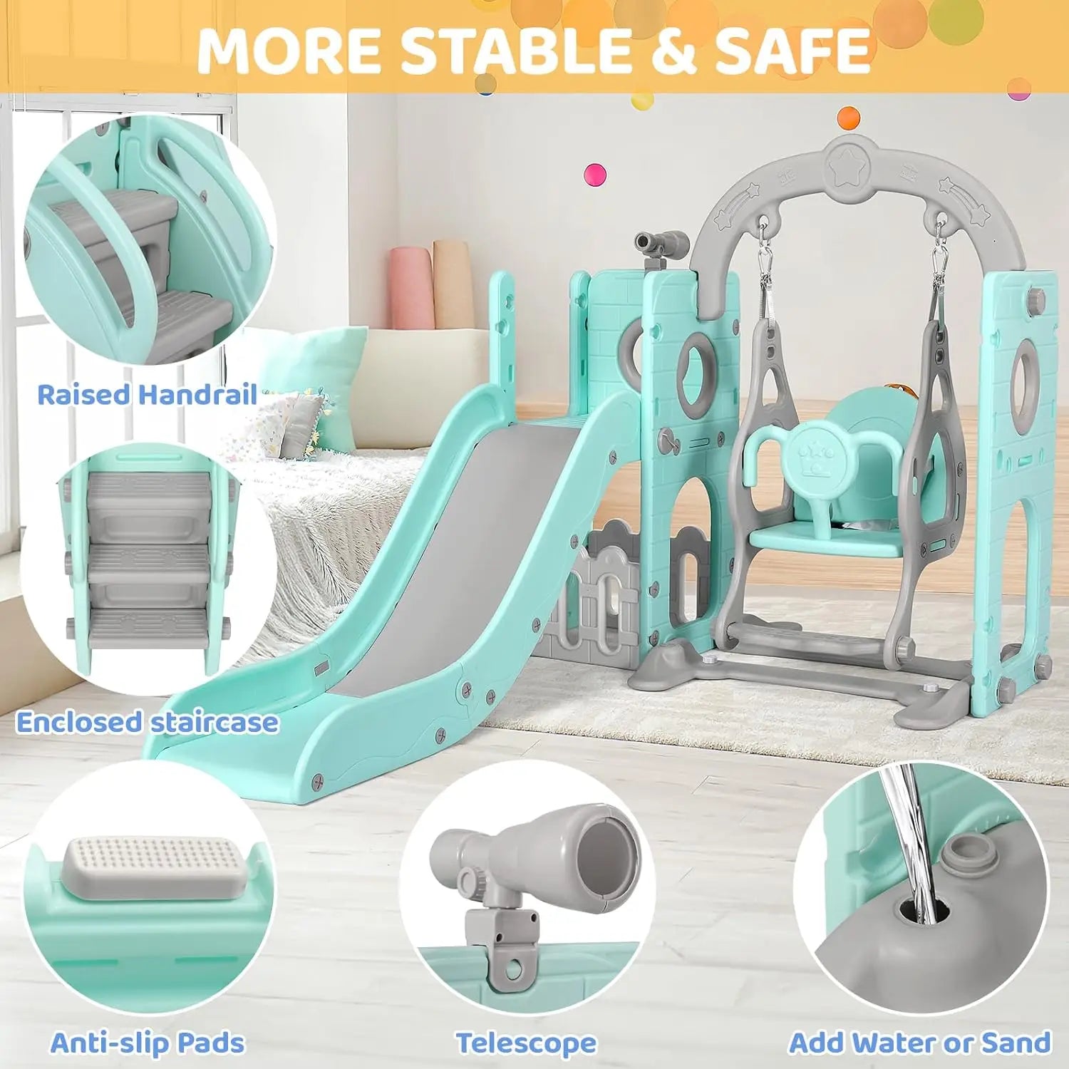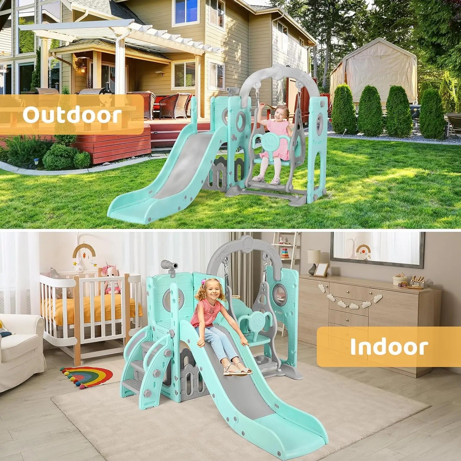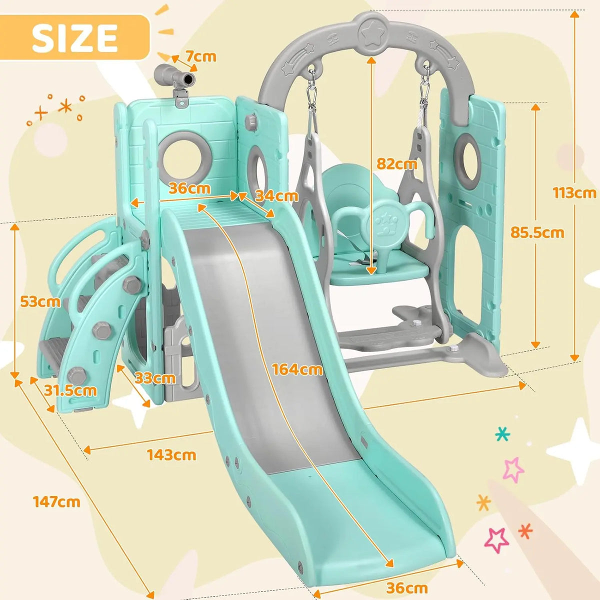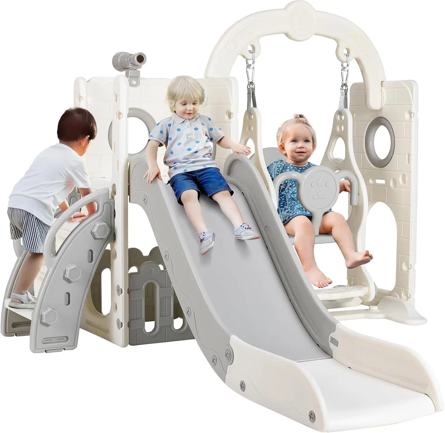 - Тип продукта: Детская горка 5-в-1 с качелями, лазалкой, телескопом и местом для хранения