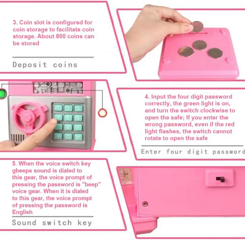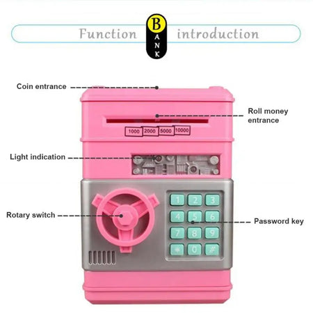 Познакомьтесь с электронной копилкой с функциями автоматического банкомата — яркой, обучающей денежной коробкой, которая делает сбережения веселыми для детей. Эта интерактивная копилка работает как маленький банкомат: дети могут вносить монеты и даже банкноты, наблюдать за ростом своих сбережений и учиться основам управления деньгами при каждом использовании.