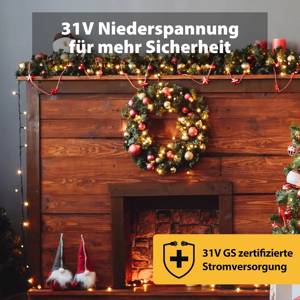 Простая, влагозащищенная и надежная, эта светодиодная гирлянда создана для использования на улице и легкой установки. Низковольтный дизайн (30-36В) обеспечивает безопасное, энергоэффективное освещение, пока вы наслаждаетесь атмосферой под звездами. Функция таймера автоматически работает 6 часов включено и 18 часов выключено, так что вы можете настроить и забыть, обеспечивая уютные вечера без хлопот. Функция памяти сохраняет последний выбранный режим, обеспечивая легкий и стабильный опыт каждый раз при включении света.