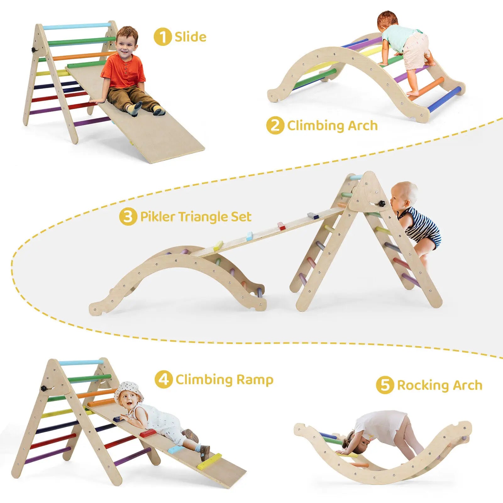 - Складная деревянная лестница-треугольник для лазания с функциями 3-в-1 (горка, камни для лазания, полированная поверхность) и сопутствующими арками/пандусами для разнообразных конфигураций.
